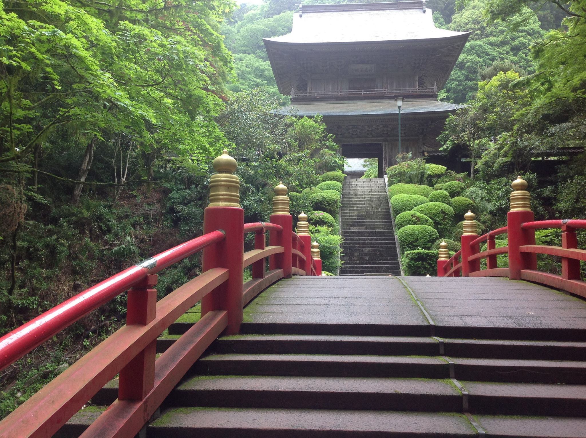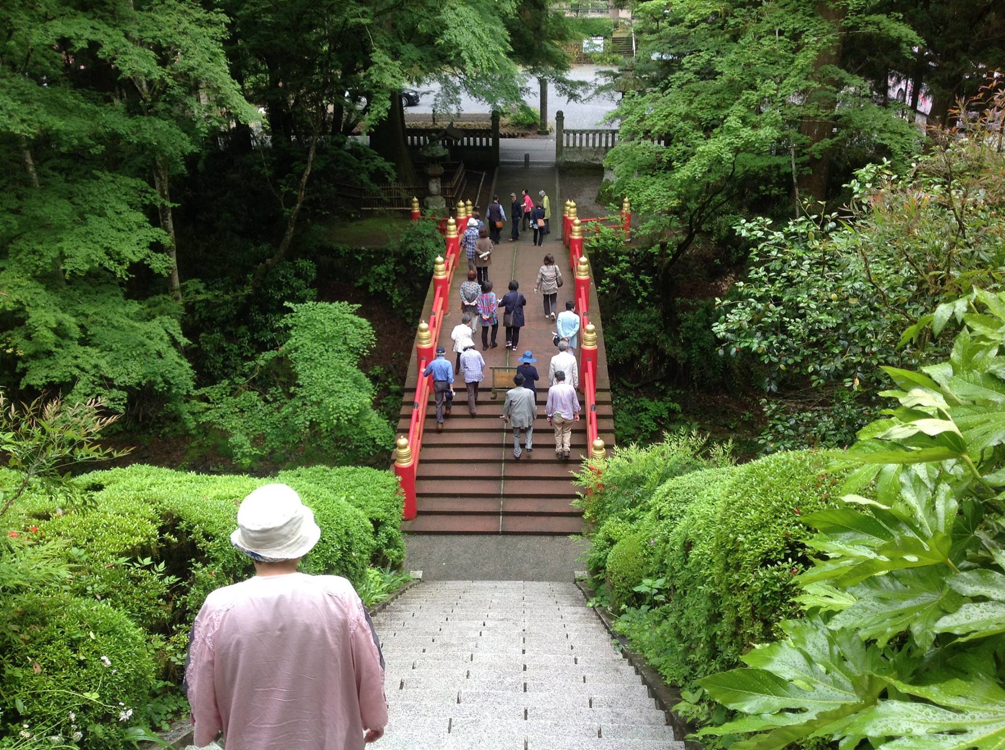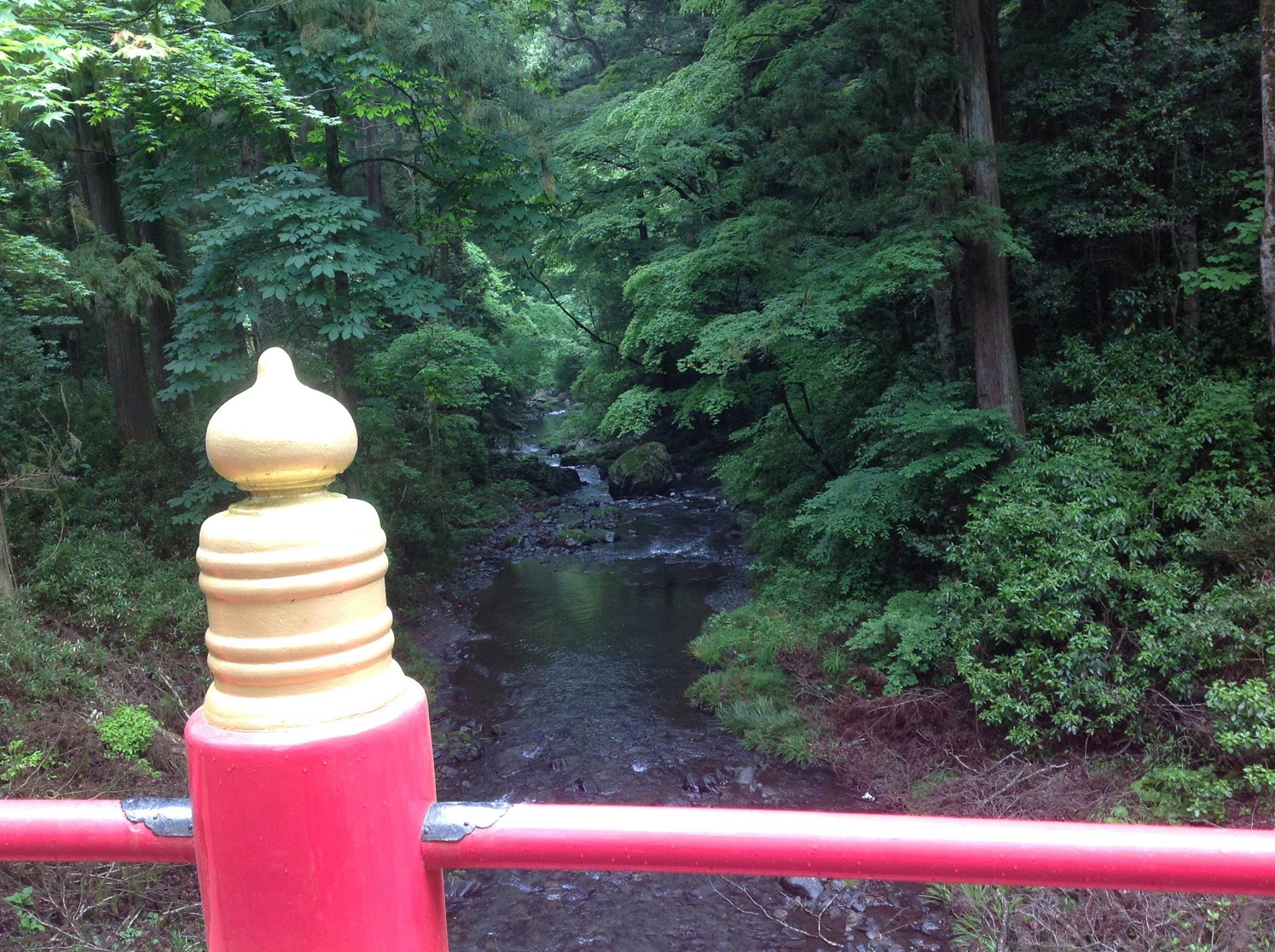 新緑の中に朱塗りの橋の欄干が映えますね。