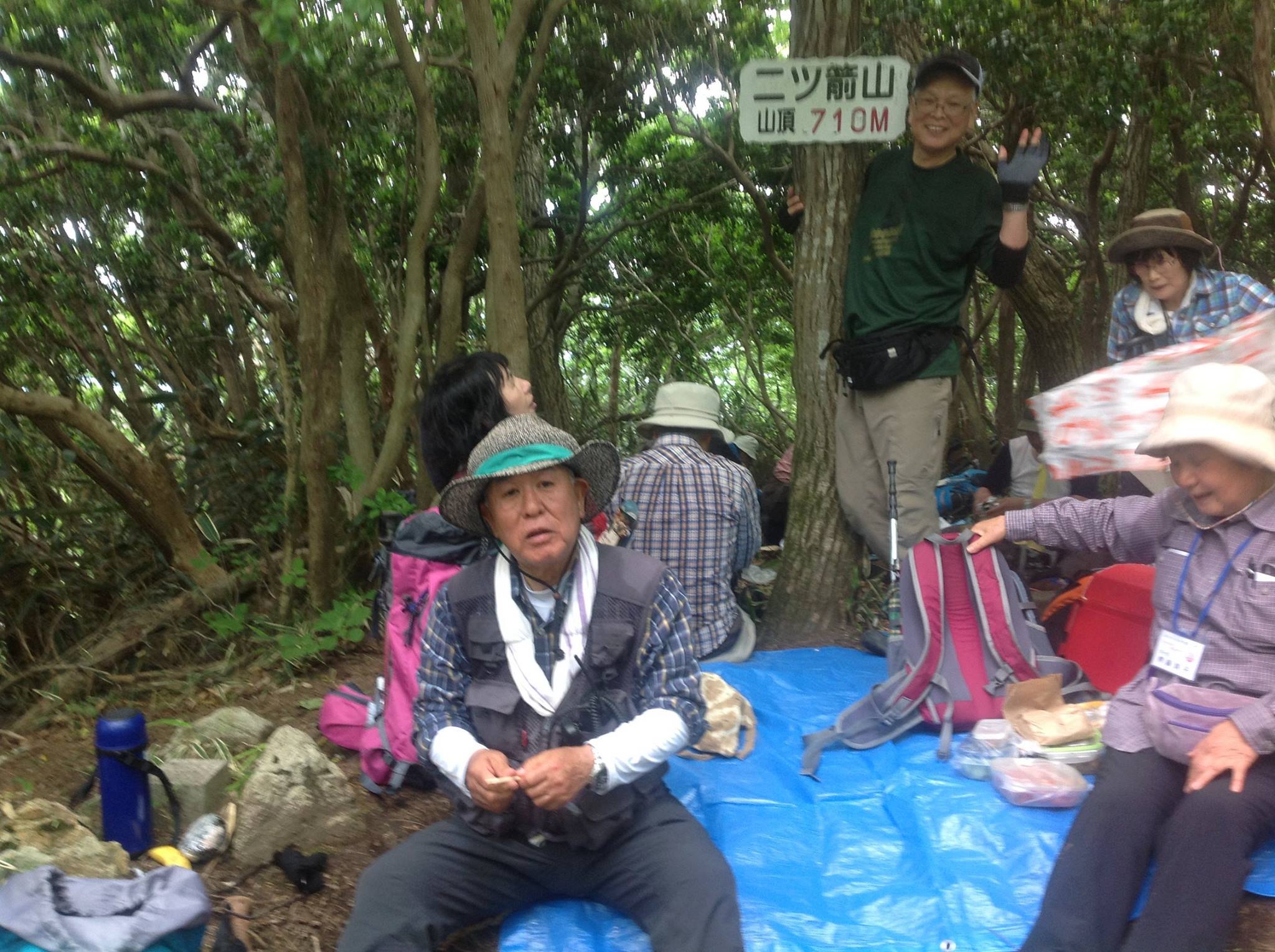 二ッ箭山々頂は冷たい谷風が駆け昇って、防寒着を1枚着込むほどでした。ごらんのように樹々に覆われた四等三角点のある頂きでした。おにぎりを食べたあとは早々に撤収、下山となりました。