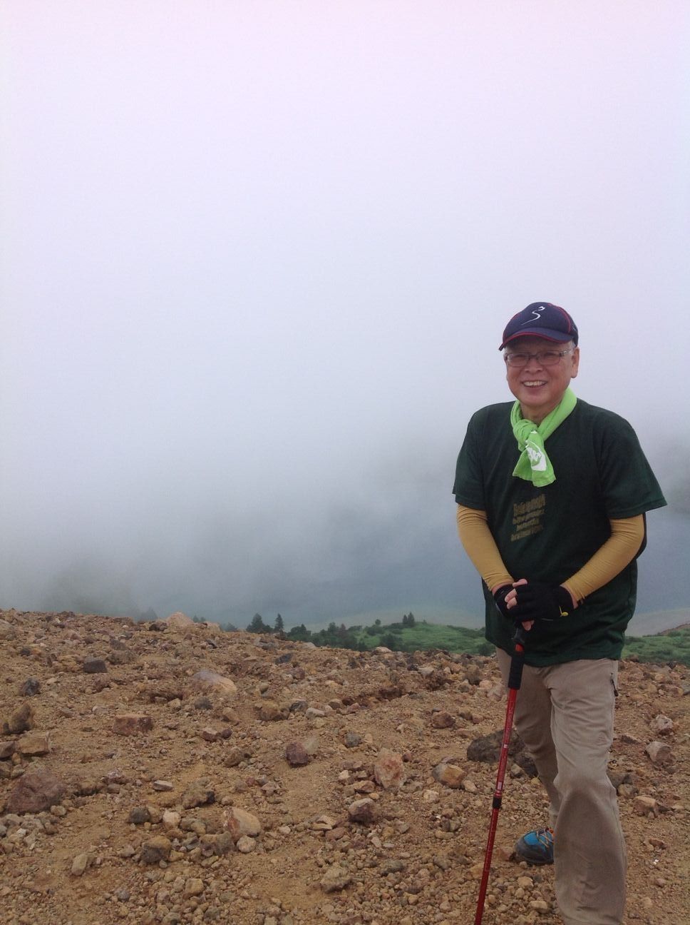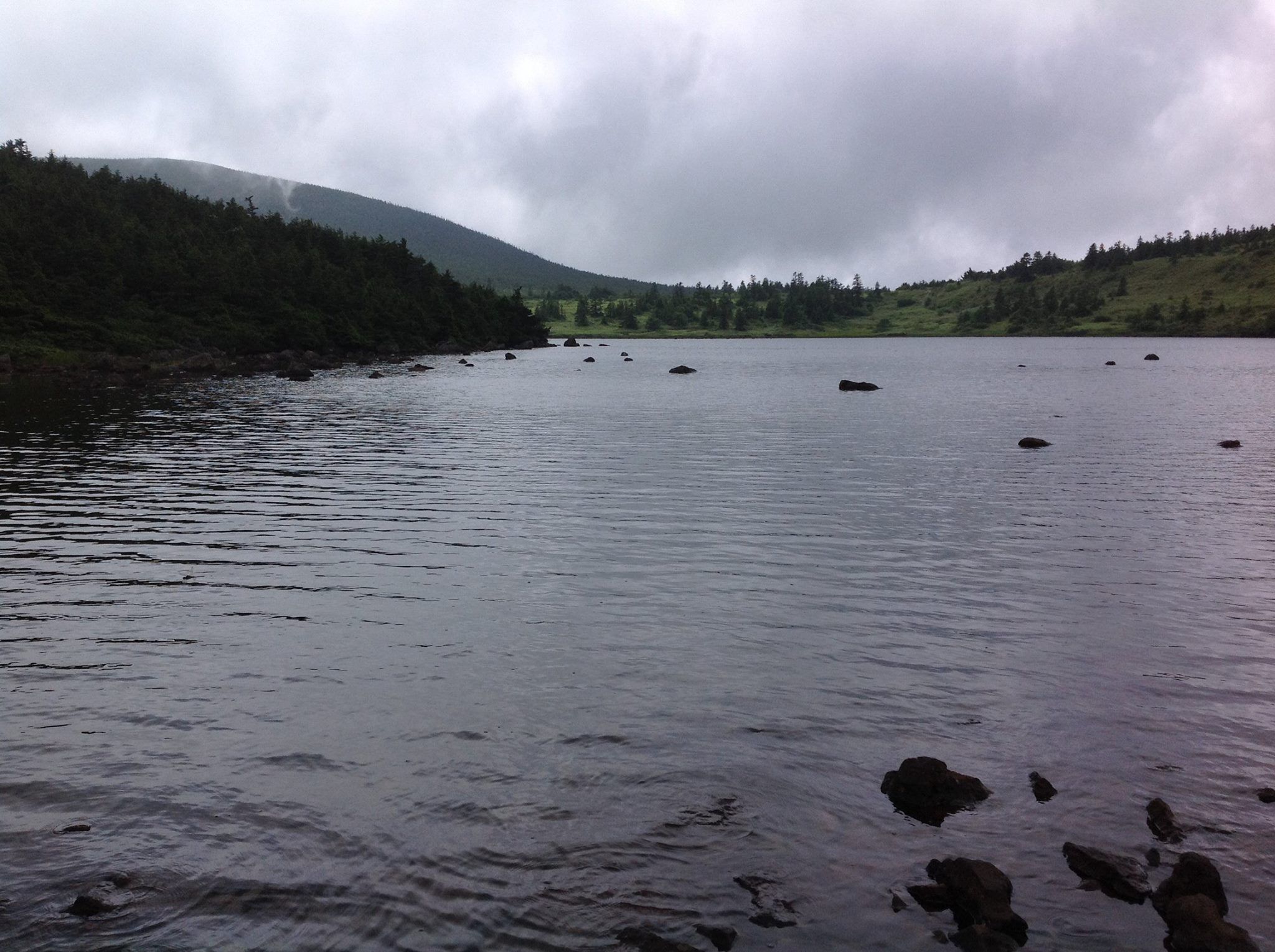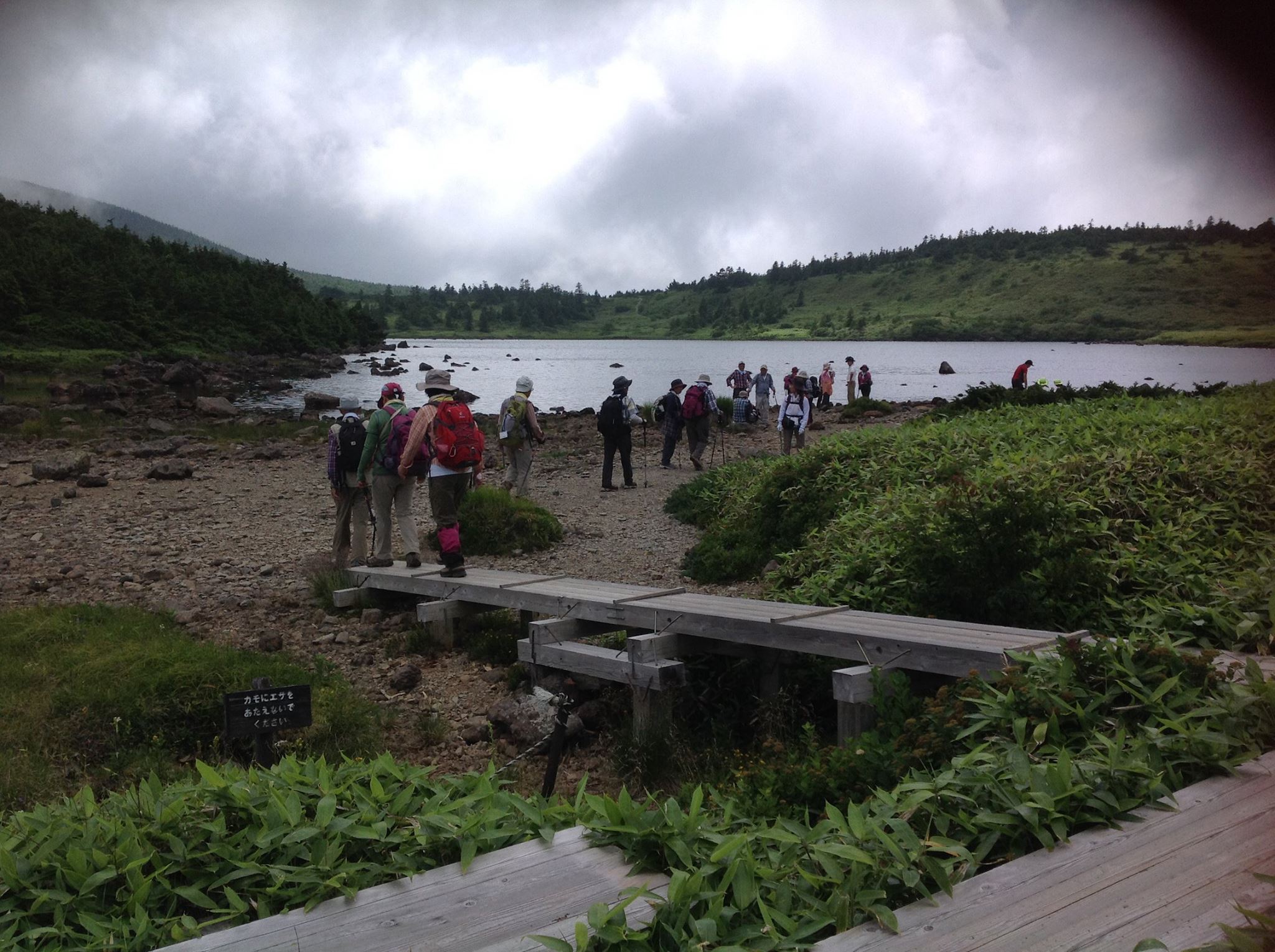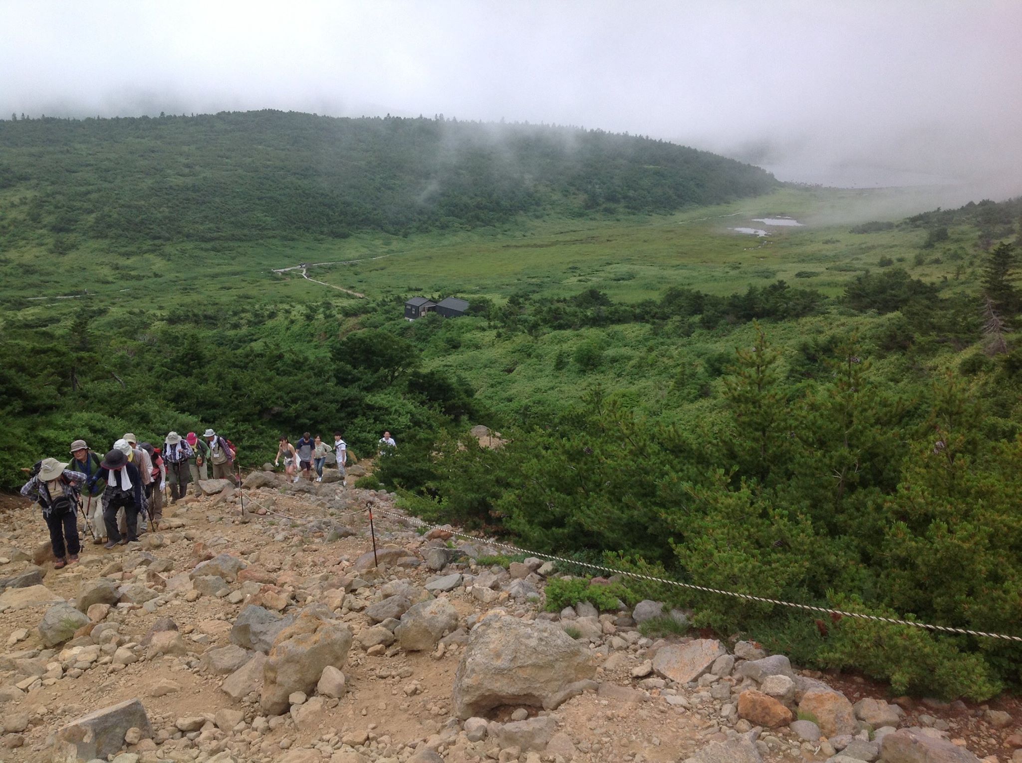 右上に霧雲で霞んでかすかにぼんやりと見えるのが鎌沼です。