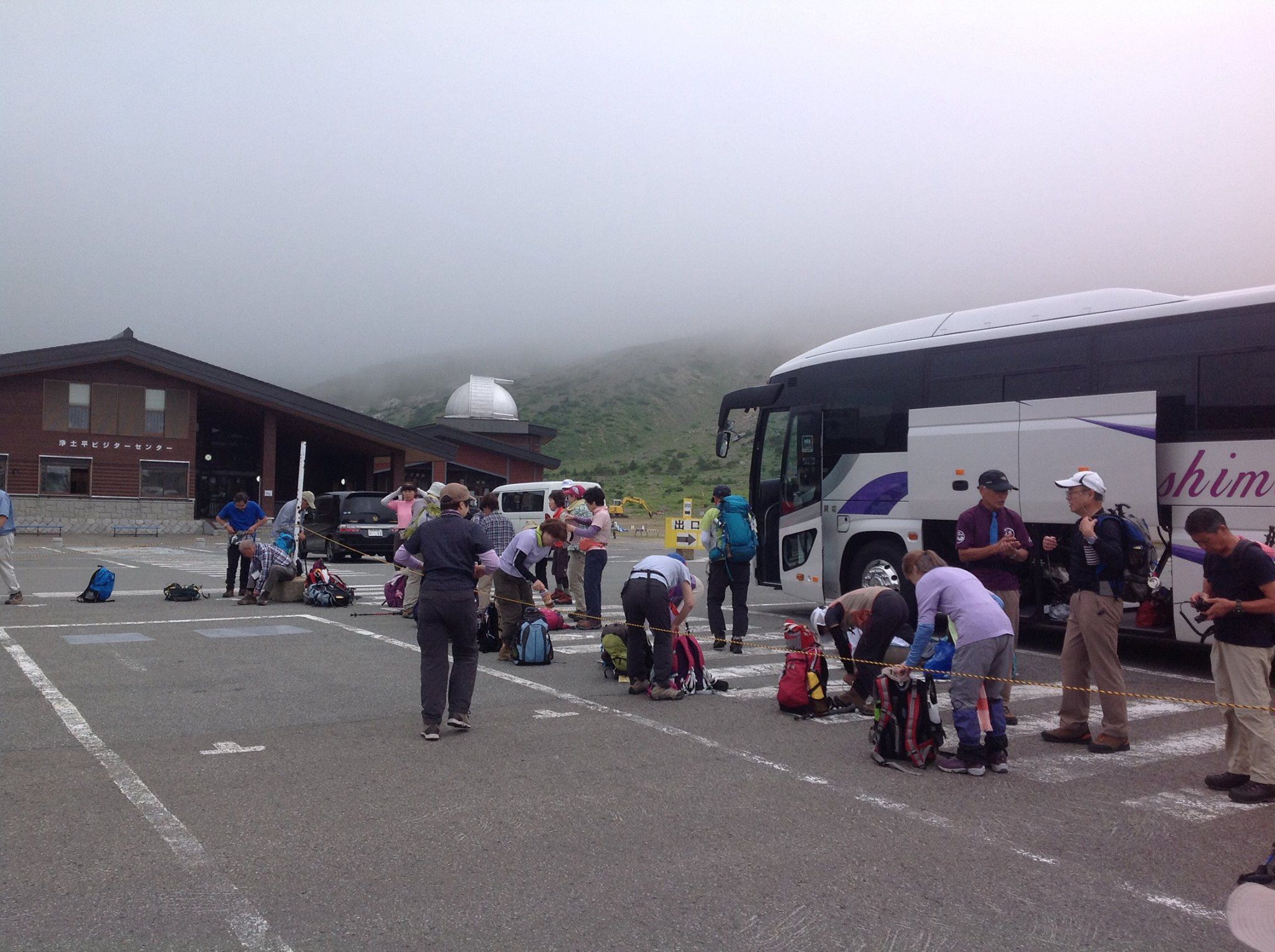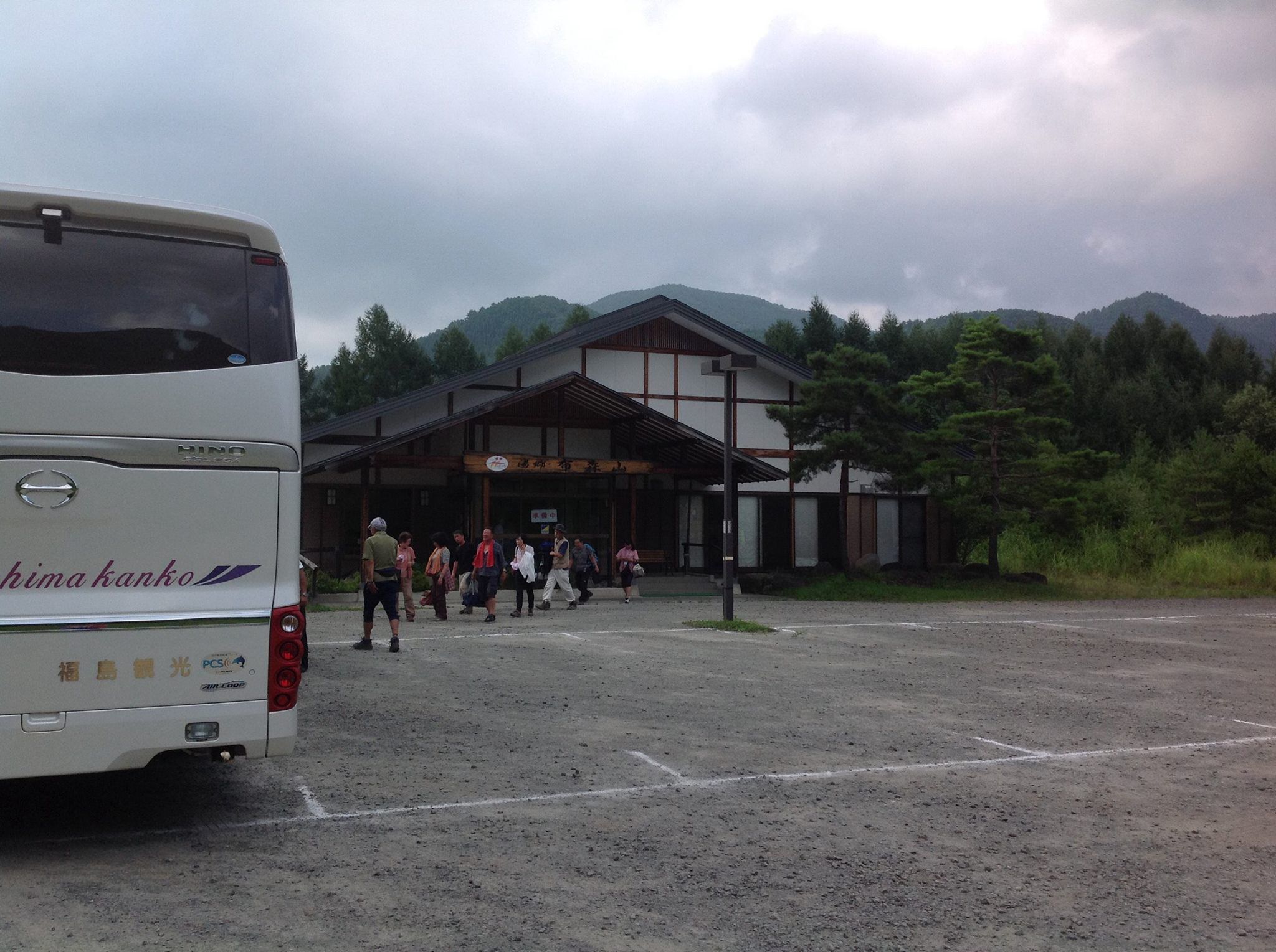 浄土平のビジターセンターの駐車場です。山はガスってます。