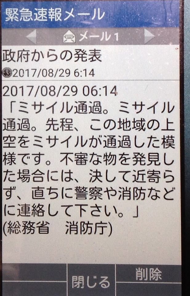 今朝は下記の携帯アラームが鳴った。携帯は寝室から離れた部屋に置いていたのでアラームが鳴ったのは知らなかったのですが、地震とミサイルいずれも寸前に警報音で知らされるわけです。丈夫な建物や地下室があるわけでなく、いざとなっても対応がとれない人がほとんどであろう。