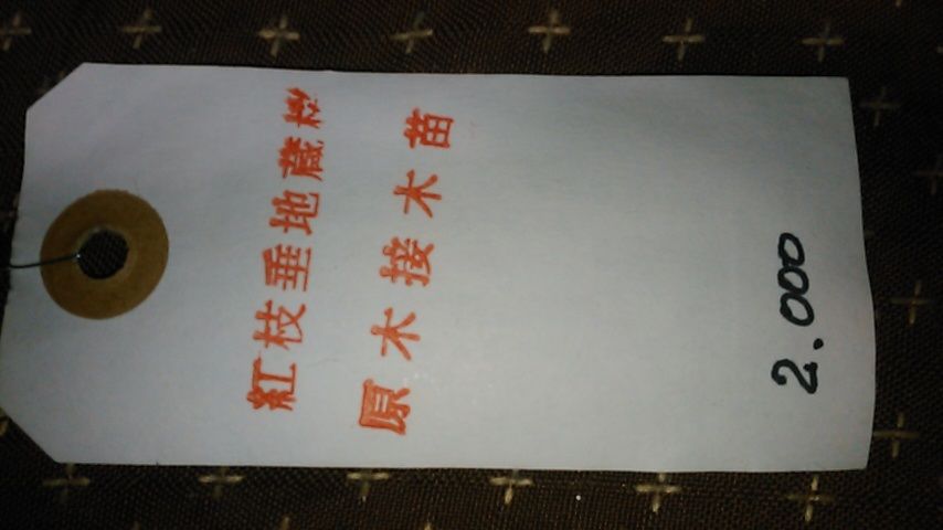 地蔵桜 を観によった折りに脇で地蔵桜の苗木を1本2,000円販売していたので運よく購入できました。滝桜の子の中でも紅色が濃いことで知られる地蔵桜、そして地蔵桜の枝を接木したものでそのまま親木の色合いを引き継いだ苗木です。