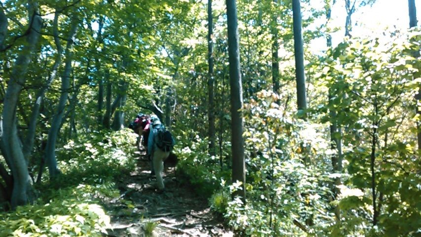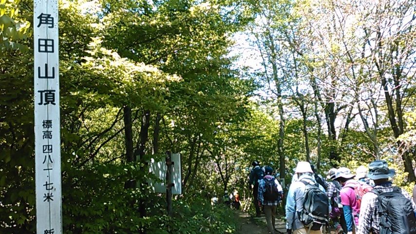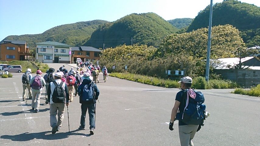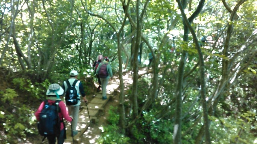 日本海々岸近くに大型バスを止めて登る山です。五月晴れの木もれ陽の中を歩く登山道。日本海からの谷風はマイナスイオンいっぱいのさわやかな風、こんなに気分のいい山歩きはなかなかありません。下山したあとは温泉で汗を流して懇親ビール!いい一日でした。