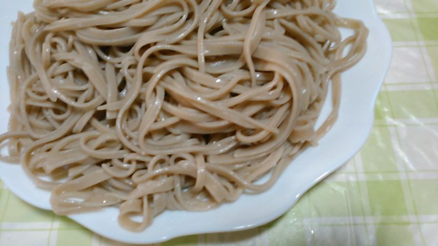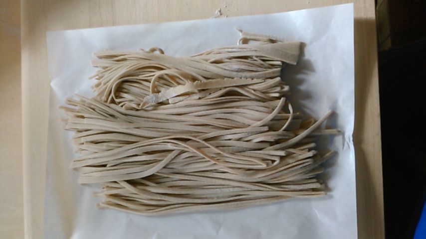 打ち粉もやらないと蕎麦がのし板にくっついてしまいました。はがすときに破けてしまいましたので、破けた生地を丸めてもう一回、最初からやり直して2度目にして蕎麦になりました。
