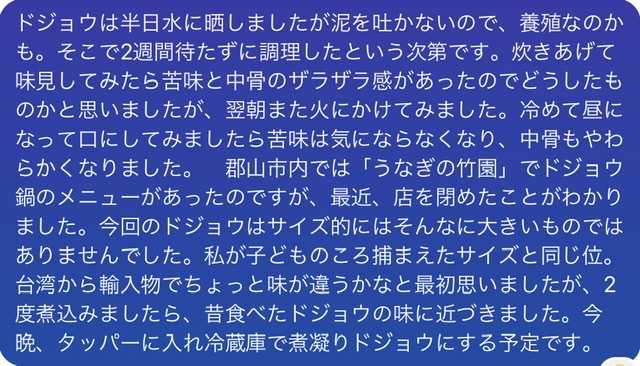 スーパーでドジョウが売られていた100g300円。マグロの刺身と同じ位の価格かも、どじょうもずいぶん高級魚になった感があります。よく見たら台湾産のドジョウでした。ドジョウを調理するのは半世紀以上のブランクがありますが子どもの頃の記憶は忘れてはいません。ドジョウ鍋にしようかなと思ったわけです。思い出すのは寒い朝の煮凝りがなんとも懐かしいわけです。あの頃は稲刈りの終えたころ田んぼの排水路の水溜まりを掘るとドジョウがいたものでした。2週間位かけて泥を吐かせてから調理したものです。 #ドジョウ鍋 #ドジョウ