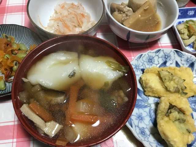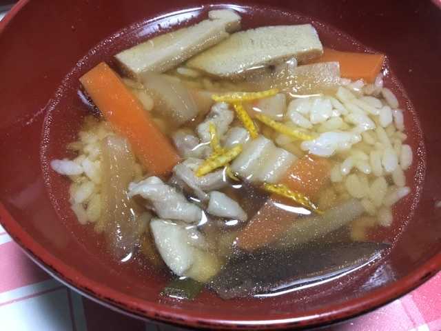 2日の夜になって、初めて定番の雑煮餅がお出ましでした。凍み豆腐入りの雑煮餅です。もうこの味に慣らされてしまった。