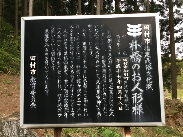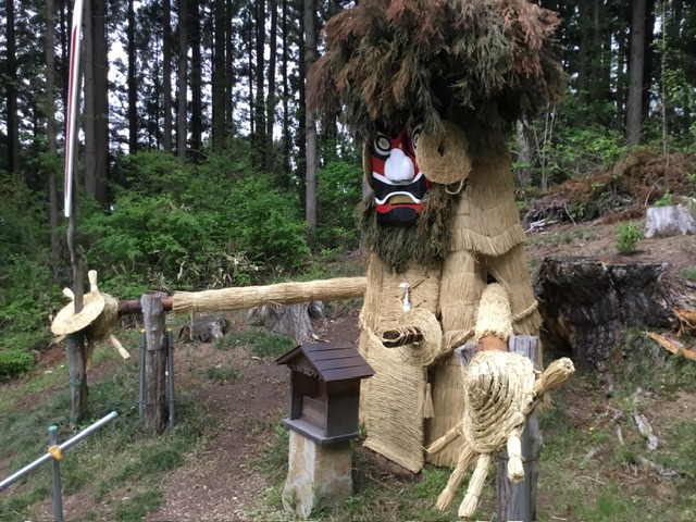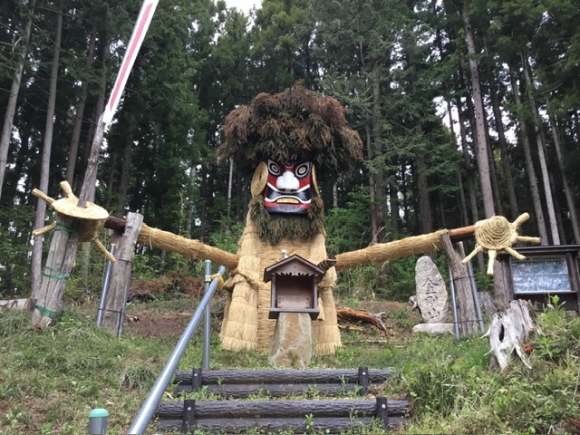 船引町のお人形様と呼ばれる藁人形。かつては5体あったそうですが今は3体に減ってしまったとのことを散歩中の近所のお年寄りに教えてもらった。江戸時代に疫病が流行った時に部落の出入口に疫病除けとして創られたのが始まり。顔立ちが火伏せの面と似ているかも。だが俄然こっちの顔の方が迫力があるね。人の背丈の倍位あります。この造形デザインを考えた先人のセンス凄いじゃ〜ないですか。