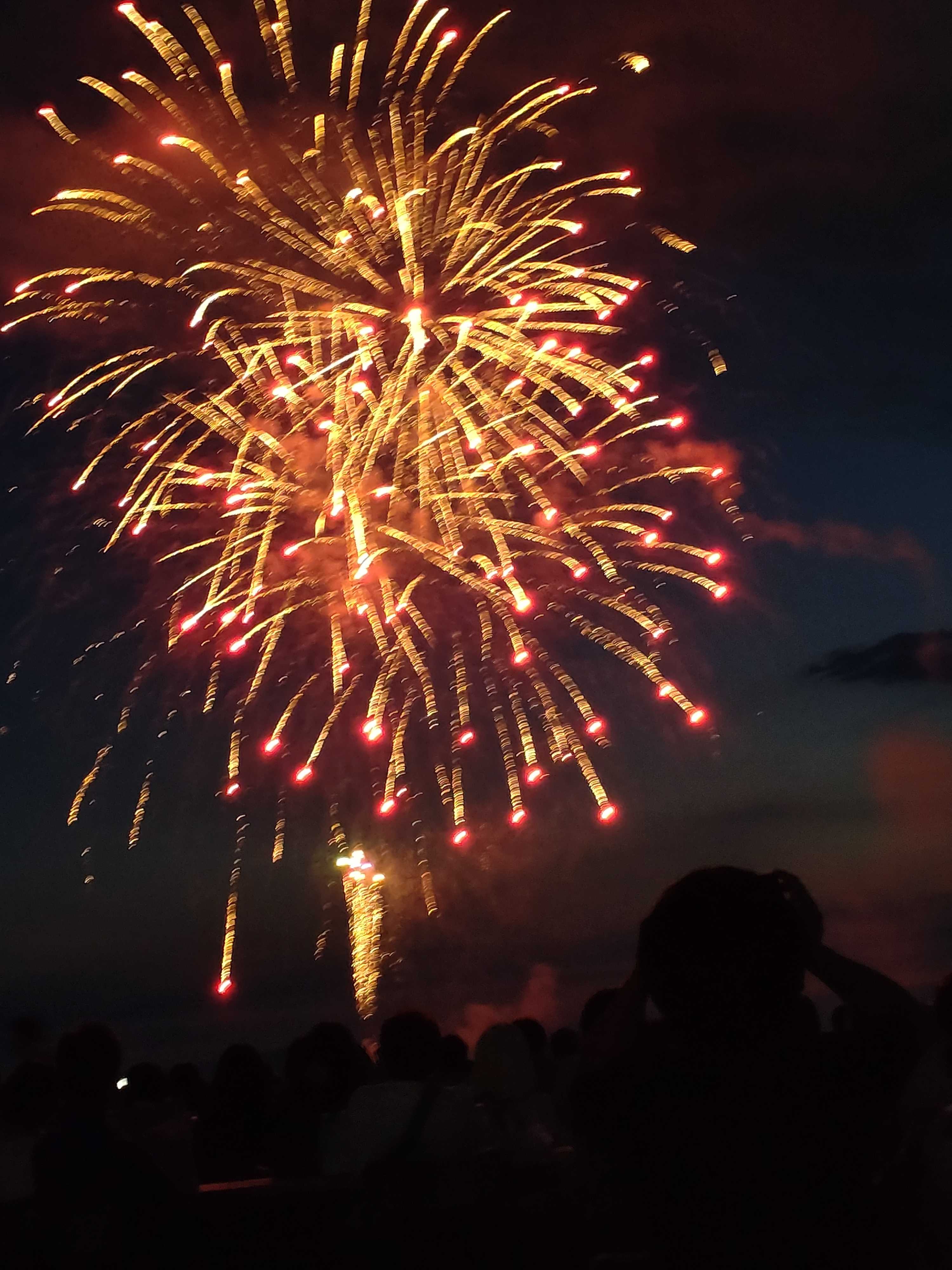 7/26長野インター13時40分出発天候に恵まれた花火会場に到着したのが16時前大型バス駐車場4台目に着いたバスの中にて待機1時間後17時に会場に徒歩で移動20分後団体指定席確認してから屋根のあるドーム会場にて座って休んで時間を費やす間にマンゴーかき氷を食べながら夕日🌇夕焼けを見られた花火開始19時30分まで長かったが花火開始になれば待ち時間も忘れ 浜風も吹き昼間の暑さも吹き飛んで行き 打ち上げ花火の音がこだまになり 打ち上げ花火の数の多さ 夜空に色とりどりの 綺麗な大輪の花火に歓喜するばかりだったか 花火会場の観客席 額に入った夕日 海に沈む夕日指定席からの夕焼け小焼け夏の夜の競演