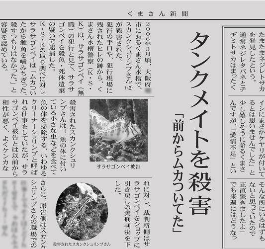 こんばんは。 今日は・・・ くまさんがまだ60cm水槽だった頃の・・・ あの・・・・ 忌まわしい事件・・・ そう・・・忘れもしない あの忌まわしい事件!! についてお話したいと思います。当時、くまさん水槽には、スカンクシュリンプというエビがいてました。このエビは色もキレイでとてもかわいくて 水槽に手を入れると、手にくっついてきて、カリカリと手をお掃除してくれます。本来は、少し大きめの魚にくっついて、魚の体に付いている虫などを食べてくれるので、魚も喜んでこのエビに近づいたりします。しかし・・・ 不運にも、くまさん水槽には、それをとても嫌う魚がいたのです。それは・・・「サラサゴンベイ」 そんな2人のいてる水槽で、事件は起こりました。そうです・・・ このかわいいエビはサラサゴンベイに殺されてしまったのです。そこで、我々取材班は、犯行を行った「サラサゴンベイ被告」の住むくまさん水槽町にやってまいりました。では、早速近所の住民にサラサゴンベイの事を伺ってみたいと思います。「サラサゴンベイ被告はどんな魚でしたか?」・・という事でした。サラサゴンベイは、普段かなりマイペースで他の魚などには無関心だったのですが、スカンクシュリンプがお掃除しにくると、けっこう嫌がってました。そしてある日・・・ スカンクシュリンプがまた近づいていった時でした。「やめんかぃコラ~~~!!」サラサゴンベイが大暴れ!! き・・キレた・・・!?岩の後ろでバトルしてたと思ったら・・・しばらくして出てきたサラサゴンベイの口からエビの触角が「ニョ~ン」と出ていたではありませんか!!きゃ~~!! エビ殺し~~!!でもその後・・・しばらくしてエビも出てきたので少し ホッとしたのだが・・・次の日の朝・・・ エビは死に・・・ サラサゴンベイの口からは、まだニョ~ン と エビの触角が伸びていました。なんという事でしょう。これはくまさんのミスです。やっぱり入れる魚はよ~く考えんとな~。と深く反省しました。みなさんも、相性問題には十分注意して下さい。二度と同じ悲劇を繰り返さないために・・・