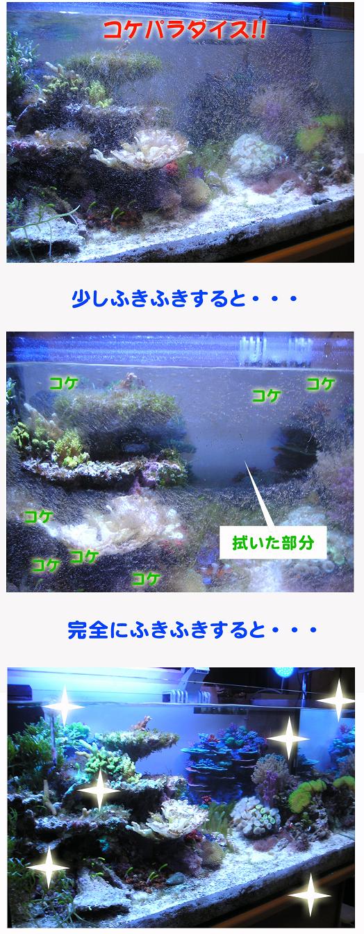 こんばんはお久しぶりの日記ですな~最近はブログばかりか、水槽のお手入れもさぼりまくっていたのでかなりコケが生えていた。。。村人:「大変や~、くまさんやい!!」くまさん:「なんや~~、こんな時間に?」村人:「くまさんの水槽に コ、コ、コケが・・・」くまさん:「コケ~? そんなわけあるかいな。」村人:「ホンマじゃ~、コケが生えとるんじゃ~!!見てみなさいな~~!!」くまさん:「も~ うるさいな~ コケなんか生えるわけ・・・ぴょでょ~!!!!生えとるどころか・・・パ、パ、パラダイスじゃ~~!!」コケが伸びて水流になびいていた。なんとか掃除したので、キレイになったものの海藻も「のびのびパラダイス」状態!!これではいかんですなちゃんと手入れしないと・・・恐ろしや・・・