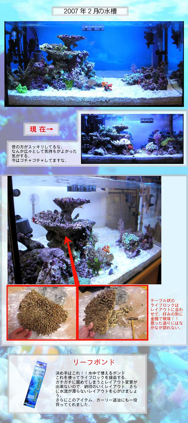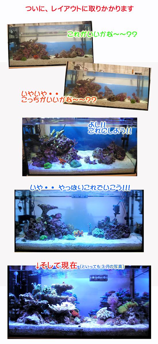 こんばんは前回の続き・・・新しい水槽を設置して、水槽の中に砂・海水・ライブロック・サンゴ・魚を入れました。さて、あとはお待ちかねの「レイアウト」レイアウトって・・ 楽しい事でもありしんどい事でもありますなやっと完結しましたなちなみに、完成したのは朝の6時くらいやったかな仕事が終わってから夜通しやりました。もちろん次の日は休みだったので泥のように眠りました。くまさん:「パトラッシュ、疲れたろぅ僕も疲れたんだ・・なんだか・・とても眠いんだ・・パトラッシュ・・・・」「くまさんは、昔飼っていて死なせてしまったナメラヤッコやハタタテハゼのいる遠いお国へ行きました。」・・・と「フランダースの犬」のように昇天しかけましたが、なんとか生きているようです。2007年.1月の事でした。