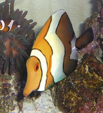 こんばんは。最近、胃の調子がわるいので「ガスター10」を飲んでいるくまさんです。この前、親戚が結婚しました。その時の写真を使ってフォトショップで「ウェディングアルバム」を作ってプレゼントするので、今はそれにかかりっきりの為、あまりブログが進みませんでした。ブログが進まないのは最初に調子にのりすぎて、「ネタ切れになった」という説もあります。まぁ それはいいとして、まだ結婚アルバムが出来てないので、いそがしいのですが今日はちょっとだけ「変な写真」を載せたいと思います。これは、クマノミも模様をしたカワハギで「クマハギ」といいます。もちろんこんな魚は実在しません。パソコンでいじって作った魚です。でもこんなやつがいたらいいな~。ちなみに、この写真の原型は くまさんが昔飼っていたゴマハギです。(ハギはかわいいです。)顔や仕草など、なんとも愛嬌がある魚です