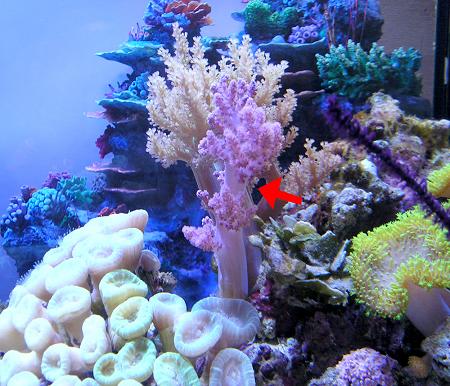 こんばんは。昨日はネジレタバネのお話をしました。その後・・ 寝る前にもう一度ネジレタバネをよ~く見てみると、「あららぁ~?」不思議な出来事を発見しました。くまさん水槽には、1年半ほど前から チヂミトサカが2つあったのですが、そのうちの1つが・・・・下の写真の手前のうす紫のトサカ、↓なんとネジレタバネの枝から生えてるではありませんか。(写真では分かりにくいですが)あららら前まではちゃんと岩から生えてたのに・・最初は岩にくっつけていたのですが、何ヶ月か前に、ネジレタバネの中にカニがいてたのでカニを取り出すためにネジレタバネごと取り出そうとした時、このトサカとくっついていたため 取り出せなかった事があったので、ネジレタバネの枝とトサカがくっついてる事は知ってました。しかしまさか完全に「引越し」するとは・・・ちょっと写真が分かりにくいので、図で説明すると、↓なんか盆栽っぽいというか、2つのサンゴで1つの作品というか・・・セット的な物体となったので、この固まりを「ネジレトサカ」 と名づけました。くまさん:「さぁ 目覚めよ! 怪人ネジレトサカよ。 愚かな人間どもを滅ぼし、この世を支配するのだ!! ハ~~ッハッハッハッハ」ネジレトサカ: 「ウ、ウガ~~」という事で、みなさん このネジレトサカが街を襲ってきたら速やかに非難して下さい。