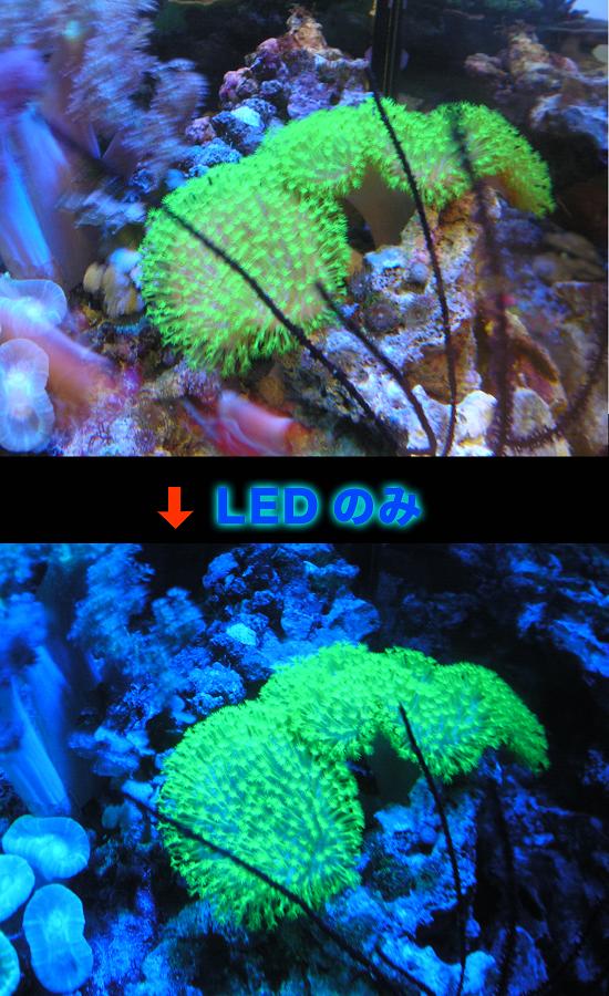 こんばんは。突然ですが、水槽ネタってやり始めた頃は「どんな魚を入れた」とか「事件が起きた」とかネタが豊富ですが、しばらく経って落ち着いてしまうとなかなか変化が無くてネタに困りますよね。という事で今回は、またまた「昔から現在」のお話にしたいと思います。ある村に、「くまさん」というサンゴ好きな青年・・・・・・・失礼。・・・・これは私が始めてサンゴを買った時のお話です。当時の私は、海水魚を始めて間もなく、ほとんど何の知識もなかったので、「サンゴ」というものに関しては 「めっちゃ難しいもんや!!」という認識があって、なかなか手が出ませんでした。そんな時に初めて買ったサンゴが、この「ネジレタバネサンゴ」でした。このサンゴは、初級から上級者まで幅広い人気が・・・ ありません (ショボン)なぜか海水魚の本とかを見ても、あまり飼ってる人を見かけません。でも私はけっこう好きなんです。そして今回はなぜこのサンゴの事を書いたかというと、ベテランの方などはほとんど興味が無いとは思いますが、初心者の方で 「サンゴ入れたいけど、難しいんかな~、簡単なやついてないかな~。」 という人がいたら、是非参考にして下さいこの個体の中には、蛍光に光る 褐中藻(サンゴなどに寄生して栄養を与える藻類)がいたので、ブルーの光を当てるとキレイな発色をします。さらに2年ほど経って、かなり成長しました。↓夜にらると、半透明の触手を出してプランクトンなどを捕まえて捕食します。今後の成長も楽しみです。是非、サンゴ初心者の方がいればおすすめしたいです