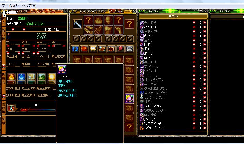 お盆ですねー!昨日から実家に帰ってるんですがまだお盆前なのに結構帰省ラッシュ始まっててちょっと驚きました。 そんな自分は有休使って9連休^q^*同じような人が結構いるんだろうな~ ネタのためにステ貼り^q^ 2日ほど前に再振りしましたw健康に振ってたステを全部力に回しちゃった完全力極wたぶんサクサク死ぬだろうけどそのスリルを味わいながら頑張ろうかと思います^q^運は隠すんだから! まあこんな感じで完全脳筋状態ですw強い知識がいたら詰みでしょうね・・・ まあ上のダメも普段GVでは回避補正無視石使ってるところを力比天球利用して力2000まで引き上げたダメですけどねw 普段のGVでこんなダメ出せませんよ。当たらなくなりますしね・・・ 剣士はやっぱりバランス型が一番強いと思いますw あと最近趣味でWinプログラムの勉強がてらシュミレータ作ってみようと奮闘中ド素人なので表示を再現するだけで挫けてますw