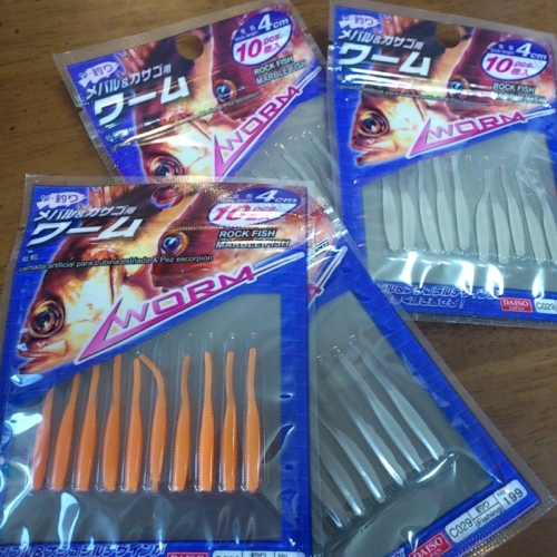 帰り道食材を買いにスーパーに寄り道。私は暇なんで 隣のダイソーに。すると・・・・・ダイソーのメバリングワームが入荷してた~~~~~~在庫が無くなって 困ってました(;^_^Aこれでメバルが釣れたことは無いのですがアジングや ギル釣りに活躍しているんでほしかったんですよ~~~~~(値段が高ければ似たものはあるが)とりあえずあるだけ買い占めてきたんで しばらくは大丈夫でしょう\(^o^)/にほんブログ村 家族ブログにほんブログ村 家庭・家族にほんブログ村 ハンドメイドブログにほんブログ村 木工にほんブログ村 車 修理・整備にほんブログ村 自作PCにほんブログ村