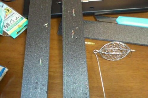 さて今日は夜勤明けですが釣りはなし(^^;)最近からだがきついのもありますけど明日の準備をするつもり。さて準備ですが 金はないですからダイソーで材料集め。いろいろ買ってきましたv(^o^)では早速 製作です。まずカゴ天秤です。材料はこちら。あ発泡スチロールはウキでした(^^ゞまず カゴについているラインやスナップをとります。そしてジェット天秤を分解。ダイソーのハンダ付けはあまいので ペンチでひねるとすぐに取れますので カットしないで済みます。細かい部品も 貴重な材料なんで ばらしやすいと助かりますね(^^;)さて使うのは天秤部分なんでこいつとカゴ、錘、ビーズを用意。こんな感じ。製品みたいに仕上がりました\(^o^)/錘は1号の中通しです。ダイソーのジェット天秤の長さが とてもいい感じなんですよ。前回 サビキの下にジェット天秤で つけ餌のハリスに一度もカラミが出なかったんでこの方法にしました。さてカゴ周りはパーフェクトです。多分ね(;^_^A次は浮き。サビキ用の安物はちょい投げでは使えますけど重いし 飛ばないし 飛行中の安定性の上でも問題でした。私は仕掛け関係を軽く作るので 浮きが一番重かったりします(;^_^A遠投用の発泡ウキも買うと消耗品なんで高いし。そこでダイソーの発泡スチロールを見て周り加工が簡単で1号に合うものを探してきました。材料はこちら。丸型ですがとにかく軽い!当たり前か(^^ゞこいつにステンレスの針金を刺します!片方をU字にまげて刺します。これで抜けない。反対側は丸くまげてスナップをつければいい。激安ウキ完成です\(^o^)/完成といってもこのままだと使い捨てになるんで表面だけエポキシで固めます。もちろんダイソー。あ夜なんで ついでにケミがつけられるようにチューブも固定。20分もすればカチカチです。これで結構持つでしょう。あ写真はないですが この後 上部分のみ赤で塗りました。昼間も見やすいですから。これでばっちりだ~~~~~とはいきません。サビキも改造します。材料はこちらダイソーサビキ4号赤スキン。仕掛けを固定する板。サビキの収納はいろいろやってますが簡単で癖が付くのはこれだけでした(^^ゞ今回もこれに収納します。さてダイソーサビキは6本針です。これの下にジェット天秤、付け餌用のハリスが付くと全体が長すぎるんです。これがネックでした。それとサビキ自体が真っ直ぐなんで 少しでも流れがあると撒餌と同調が難しかった。そこでサビキの本数を半分にしてその下につけ餌はリスを繋げばいいんじゃない?となったんです。こうするとサビキは1セットで2セットになりますんで100円で4セットになり コスパもよい。付け餌の針はダイソーのアジ針5号ですんでハリスつきで10本入り。サビキ3本の下につけ餌用に2本つけることにしました。これで籠の下には錘はないので仕掛けは自然沈降し いい感じになると思う・・・・・思いたい!でとりあえず2セット作りました。明日が楽しみです\(^o^)/あうずうずして夜中に全部セットして室内でテストしました。竿は激安2.7メートル。リール激安380円これに仕掛けをセットしました。おおおおおおおおめちゃくちゃ軽い(>_
