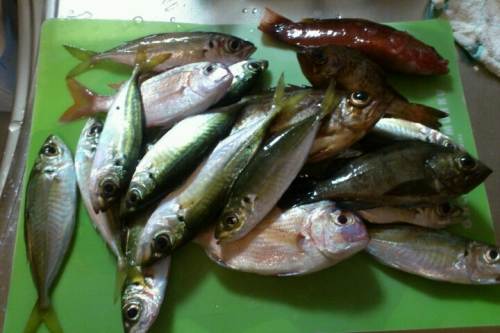 朝から娘を幼稚園に送り出しそれから釣りに出発(^^;)いい時間を 逃した気がしますが仕方ない。さて前回 いい思いをした黒口です。今日は風や雨は少しだけ。釣れそうな気がする。早速 鯛用の半誘導仕掛けで行くぞ!が反応薄い・・・・・どうやら 潮が引いている・・・・思うに ここは満ち潮のときしか釣れない。時々釣れるのは根魚ばかり。そうしている間にも 潮はどんどん引いてしまいます。結局 4時間で撒餌もなくなり帰ることに・・・・とその頃に 回遊魚の群れが!空も晴れてきました・・・・くそ~~~~今日はついてなかった(>_