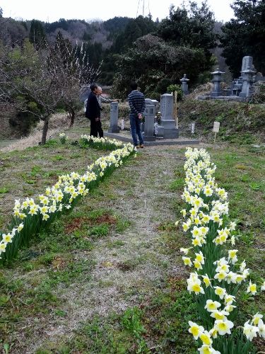 先日やっと母の納骨を済ませました。49日に大雪が降り、納骨できなかったのです。新しいお墓に、兄と甥、父、おばとで、母を収めました。甥は遠方から、わざわざ来てくれました。花の大好きだった母が、この季節を選んだのでしょうね。母の植えた水仙が、花道を作っています。母の戒名には「蘭」という文字が使ってあります。母は紫系の色を好んでいました。母の祭壇をやっと片付けたのですが、どうしてもあかない仏壇の引き出しがあって、みんなであけようといろいろ試みたのですが、あきませんでした。最期に甥が手で普通にひっぱたら、なぜかあいたのです。中は大したものは入っていませんでしたが。ご先祖様や亡き母から甥へのメッセージだったのでしょうか。甥は実家の直系の跡取りという立場です。