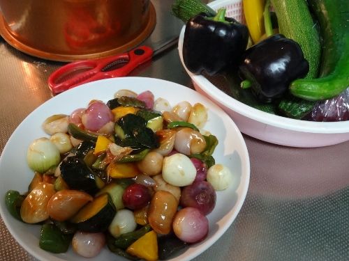 紫玉ねぎのチビちゃんや、黄色やみどりのズッキーニ今年は紫のカラーピーマンなど色とりどりの夏野菜ができました。みんなおばあさんと、夫ですけどね。私は今年はうつうつとしてしまって、畑は犬の散歩で通るだけで、一切世話をしていません。でも採れた野菜は無駄にせず大事に料理をしていただきます。カラフル野菜とウインナーで酢豚風の味付けの炒め物をしました。野菜の甘さが引き立ちました。