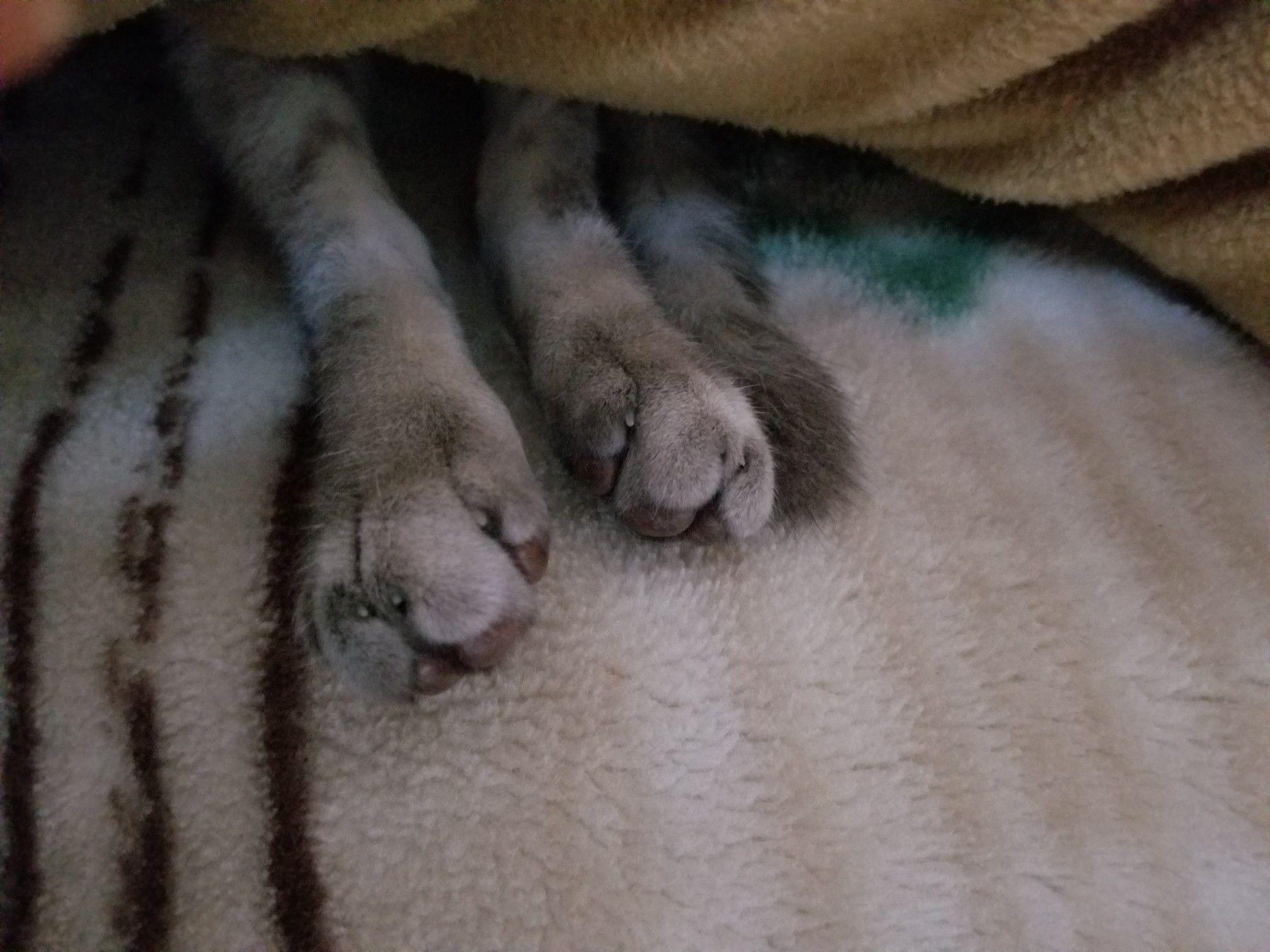 こたつからのぞいている、まろにゃんの足。 最近めっきり暖かくて、こたつは電気を入れてません。 えへ、どんな格好で寝ているかな。 べろーん、だわ。 今日は一日雨。 暖かいけどジメーとしています。