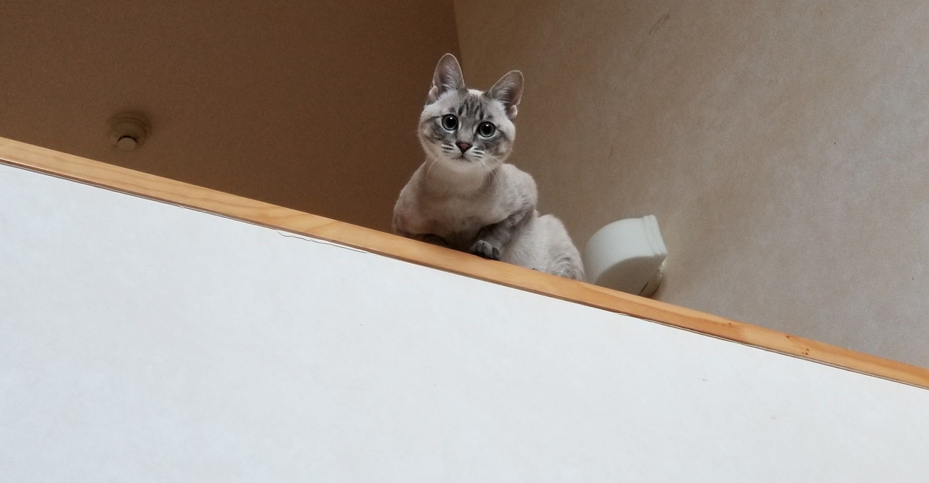 あさ、憂鬱な気分で玄関に。 玄関は吹き抜けで、裏側に階段があるのですが、踊り場から私を見下ろしています。 かわいー! あ、危ない、降りれる高さではないわ。 やめてー、お父さん、つかまえてー! 2階にいたお父さんに確保してもらいました。 憂鬱な気分はぶっ飛びました(* ̄∇ ̄*)