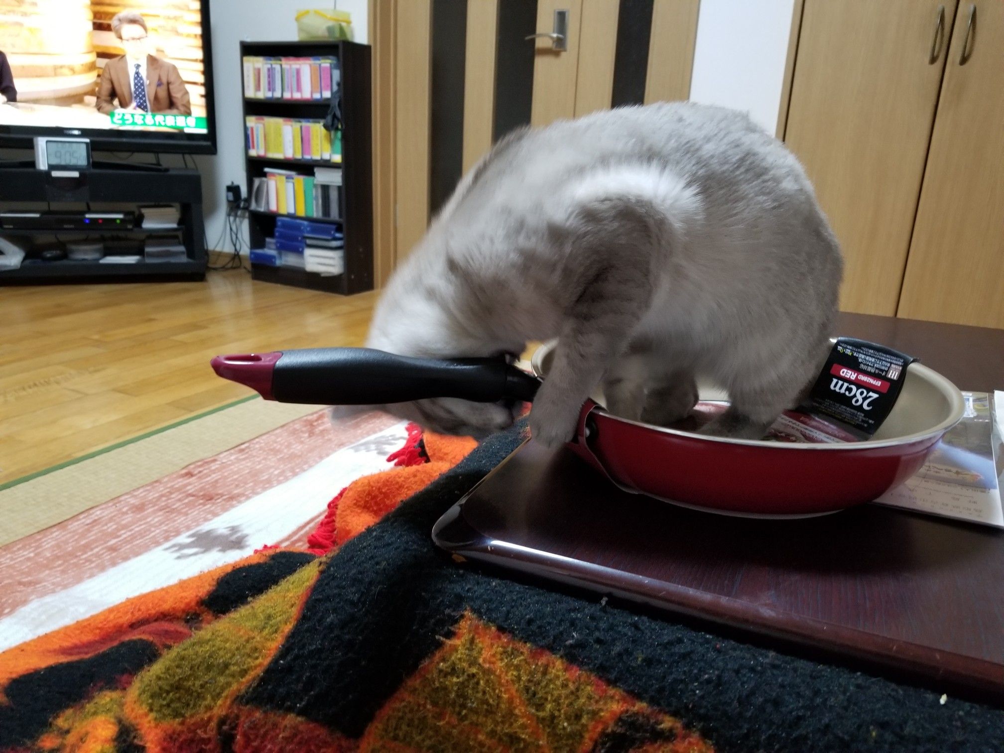 新しいフライパンに入って かじるのはなぜに? 謎の行動。 お父さんは会合、お母さんはダンスで、やっと会えて嬉しくて、こうなっちゃう❤️