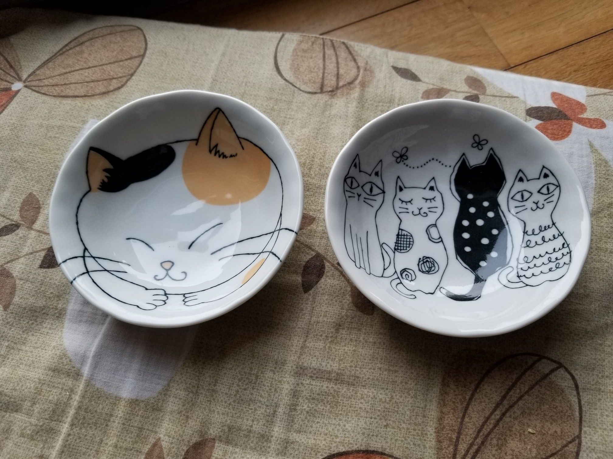 100円ショップで、お皿発見。 かわいいにゃんこ皿。 マロは食べるのがとても下手でいっぱいこぼします。 600グラムの子ねこのときのお皿では小さすぎますね。 水を飲むのも下手でいつもむせています。 早速新しい物好きのマロがやって来ました。 ちょっと深くなっていて、こぼしにくくなりました。