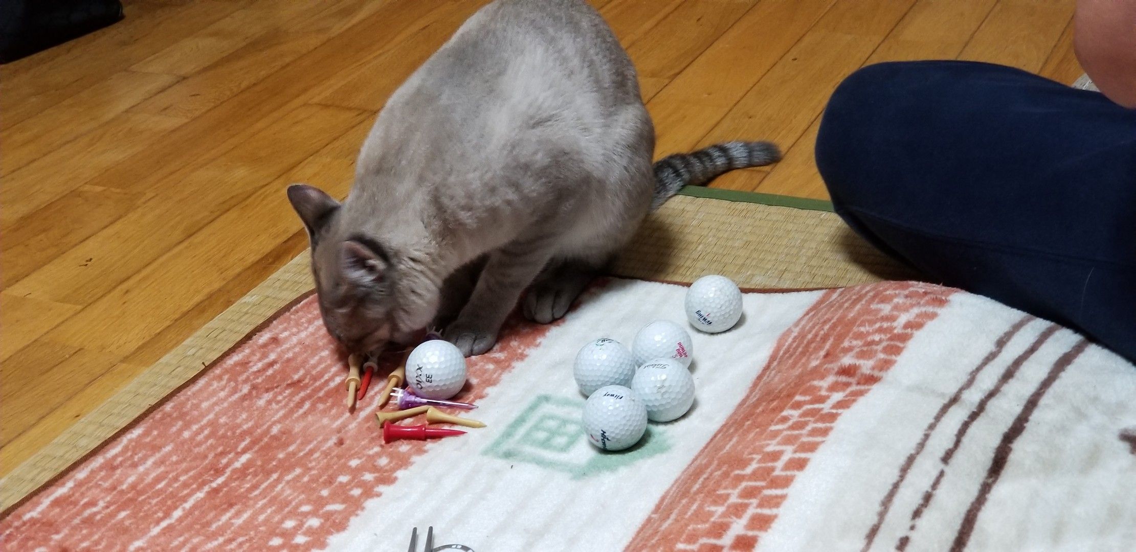 お父さん、ゴルフの準備に😃🎵。 油断大敵、やって来ますドロボウさん。 ピンをくわえたり、ボールを転がしたり。 お父さんが、あわててしまっちゃった。 つまんないの。