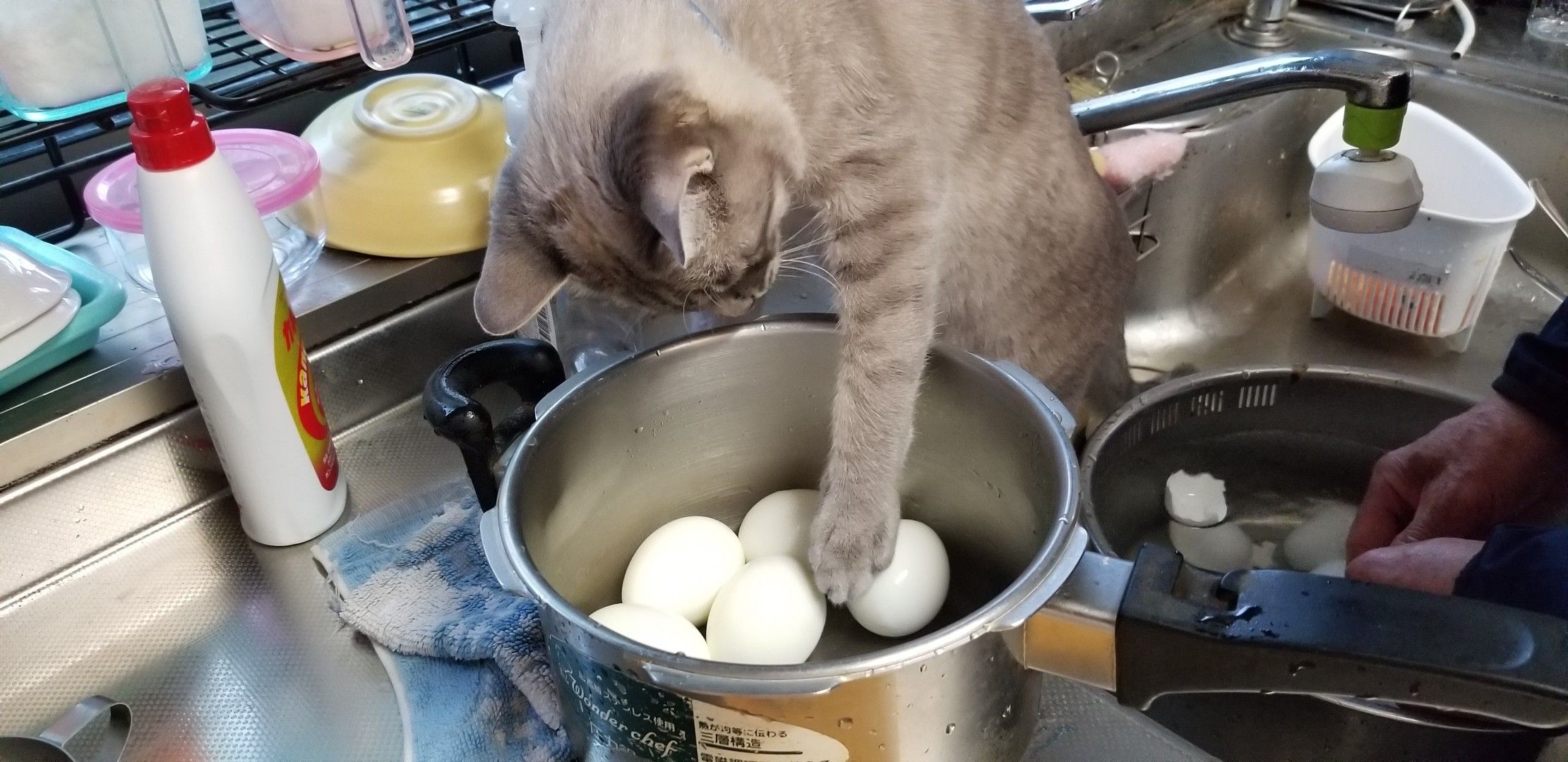 お父さんが煮玉子作ろうと、殻をむいているとめざとくマロがやってきて、鍋に👋をつっこみます。 ヽ(♯`Д´)ノコリャーッあ! 叱られたわ。 その後確保連行されました。 以前に比べてずいぶん落ち着いてきましたが、 まだまだやんちゃ。