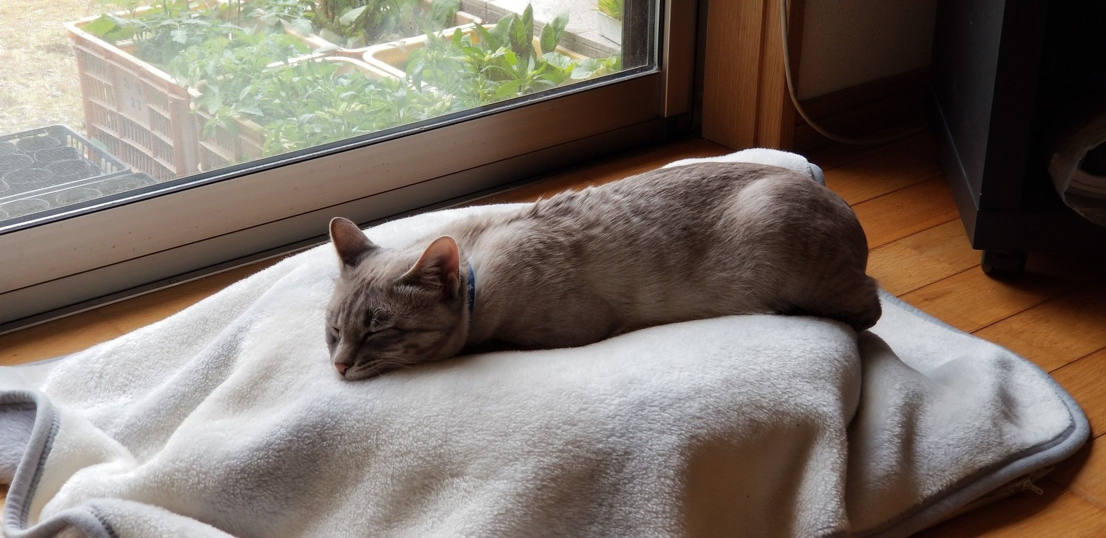 窓辺でべろーん。 カーペットでばんざーいしてる。 ねむいねむい。