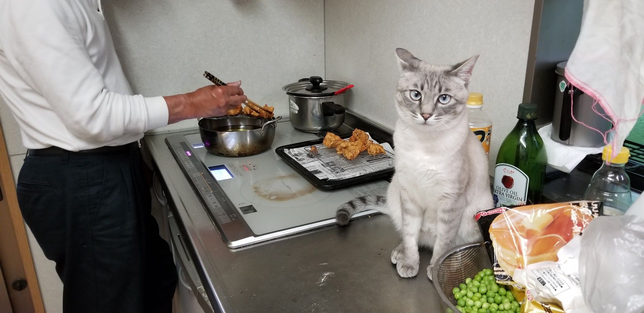 今夜は唐揚げか。 お父さんの唐揚げ。 味見してやろうか。 でも、お父さんに阻止された。 ケチ! 唐揚げはねこさんには塩辛いから、ダメです。