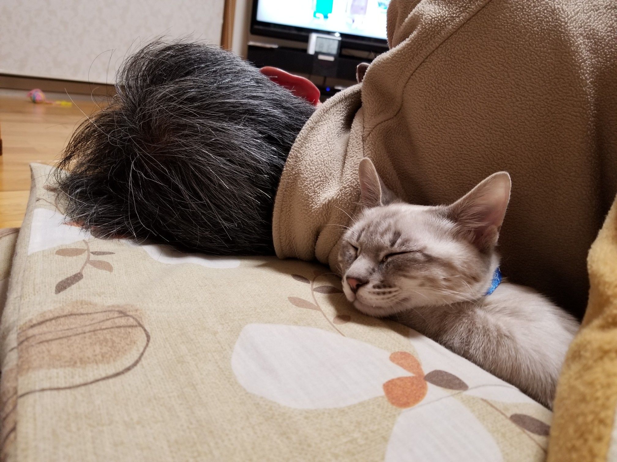 遊び疲れて、酔っぱらいのお父さんと寝ています。