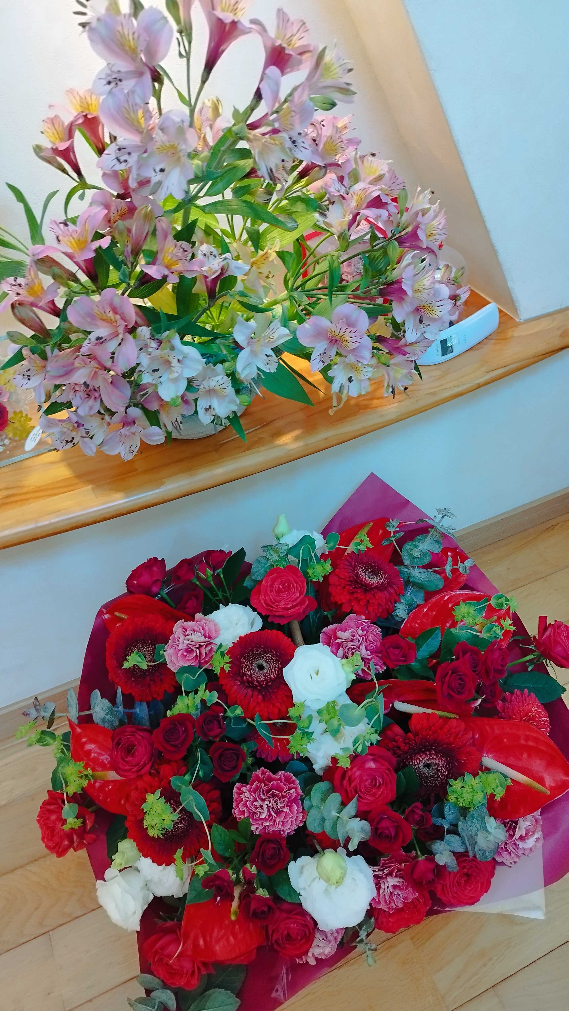 お嫁さんの手作りチーズケーキ、花かご、孫からのメッセージカード。
