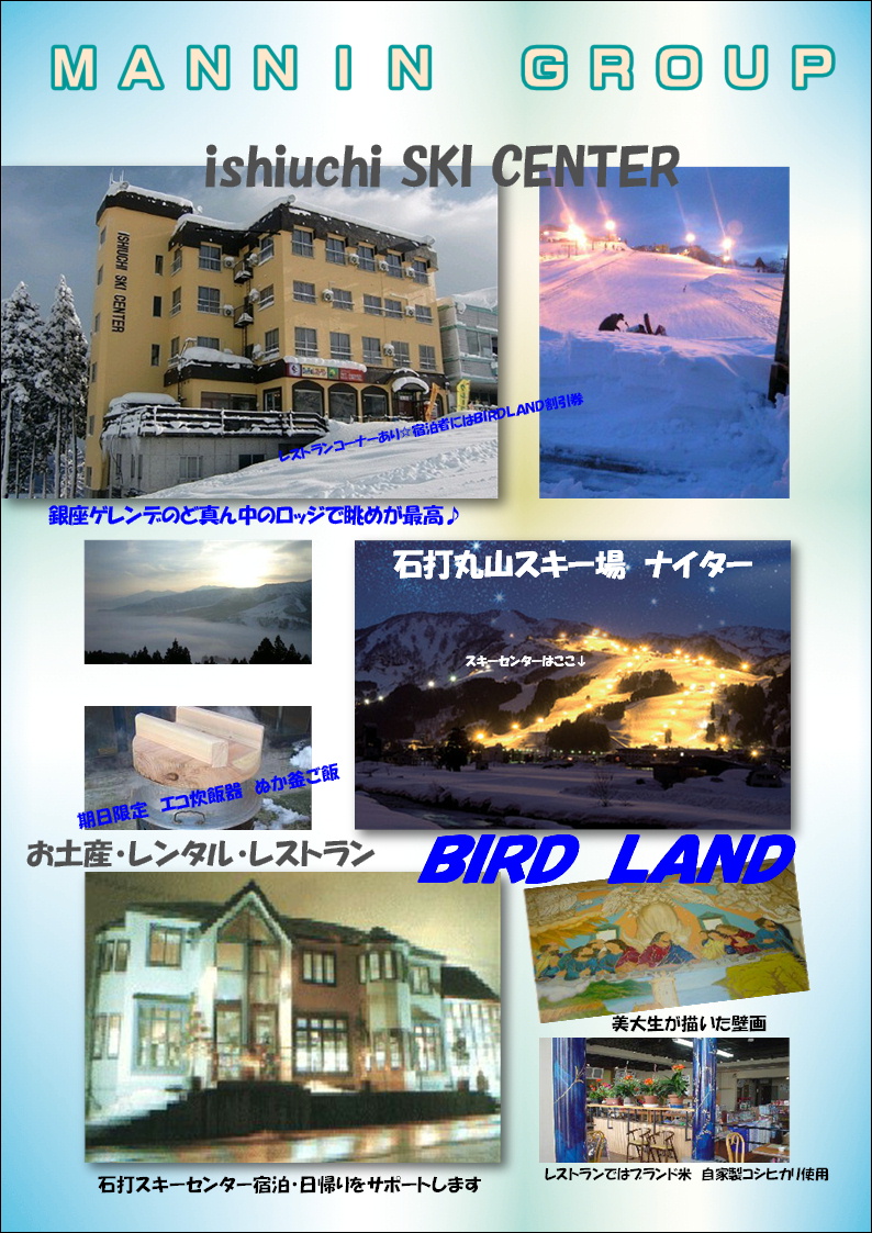 石打丸山スキー場は、12月15日OPEN予定です。萬仁グループは、12月20日より営業予定です萬仁グループの楽天トラベル宿泊プランが今年は盛りだくさん!今年は、楽天トラベルの宿泊プランをさらに充実しました。今後、カスタマイズページなどの充実予定です。おみのがしなく楽天トラベル☆石打スキーセンター 楽天トラベル☆萬仁旅館★日帰りの方はBIRDLANDで!~萬仁グループのスタートハウスでもあるBIRDLANDは、日帰りのお客様もしっかりサポートします~◇営業案内◇レンタルお土産レストラン仮眠室浴室無料更衣室スキー用品スナック・ジュース類平日無料大駐車場コインロッカー割引券各種あります。事前にBIRDLANDの割引券をチェックしてね。初めての方は、萬仁グループのメルマガ会員登録で、BIRDLAND和英引き券をGET!メールアドレスのご登録でお得なクーポンを発行しております☆ご予約は是非!こちらから