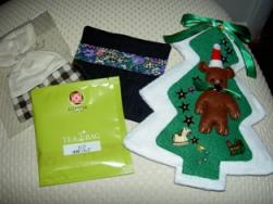 日本は荒れ模様の天気のようですが、みなさん大丈夫でしょうか?お出かけなどくれぐれもお気をつけてくださいね。さて、ブログをお休みしてる間に素敵なプレゼントをいただきました。遅くなったのですが、とても嬉しかったのでご紹介させていただきますねブログで仲良くさせていただいてる「りんごとれもんのママさん」とママ友達のNちゃんからクリスマスプレゼントです。 「りんごとれもんのママ」さんはとても素敵な方で、憧れてるママさんです。なのでカウプレに厚かましくも応募しちゃいました~手作りのコースターと、お子さんたちにちなんだ、アップルティーとレモンシャーベットの香りのポプリです。と~ってもいい香りで育児の合間にリラックス・・・ お友達のNちゃんが年賀状と一緒にかわいいクリスマスツリーの飾りを送ってくれました。フエルトで一針一針、手作りです。とっても凝っててかわいいです~~(ソフトバレーとヨガ、頑張ってねー! 帰ったら私もいろいろ参加したいのでヨロシクです) それと、ブログでいつも楽しくおつきあいしてるお友達から、夏の引越し前に応援メッセージと一緒に温かいプレゼントを頂きました。ナツコの孫さんとblue moon blueさんからです。私がビーズが好きなので、 扇子にちょこんとビーズの飾りがついてるのココロニクイですこのお二人はとても優しくていつも温かい気持ちを分けてもらってます。アメリカに行く前に元気を分けていただきました。頂いたプレゼントを紹介するのって、自慢してるみたいかな?と今まで気にしてたのですが、やはり嬉しい気持ちを伝えたほうがいいですよね!お友達のブログを見て感じました。遅くなっちゃったけど、本当にありがとう!