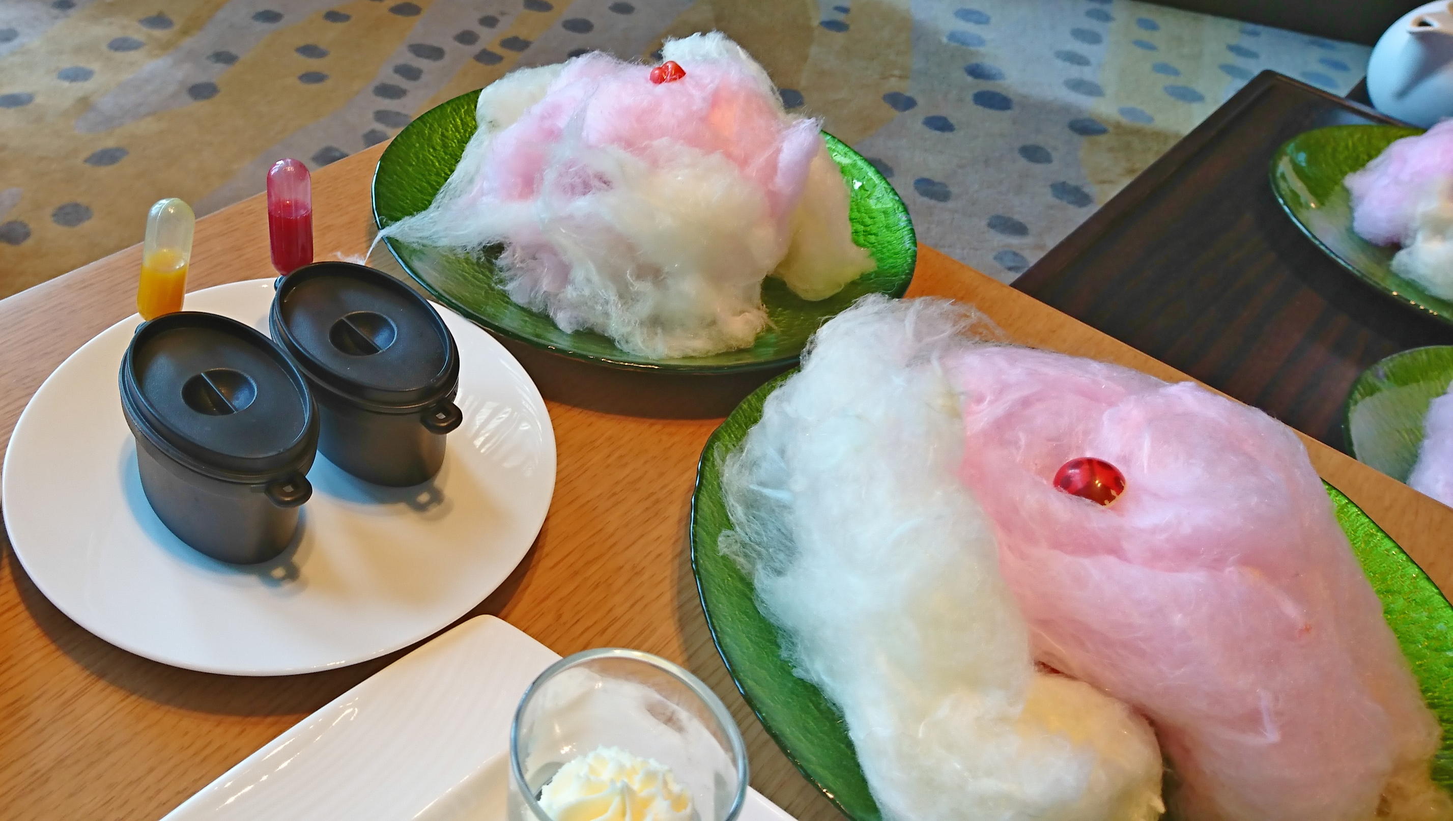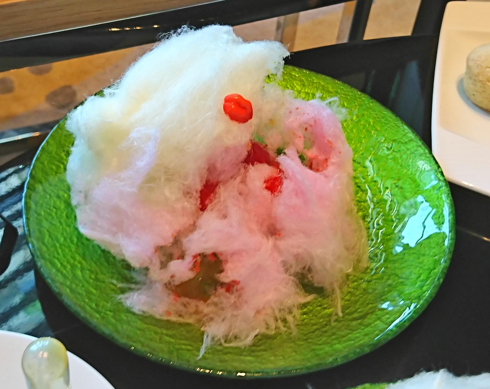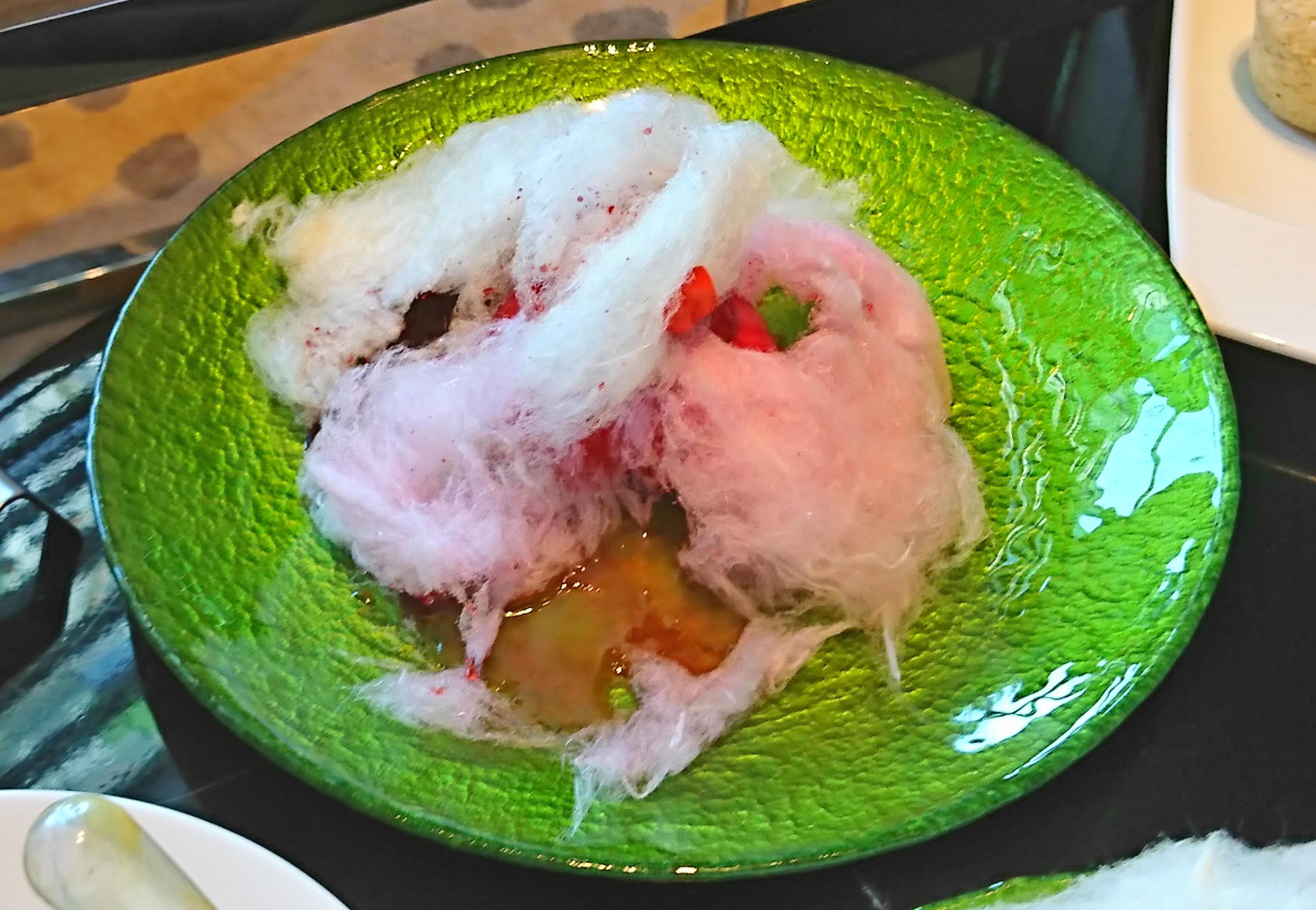 コットンキャンディーにソースをかけると、みるみるうちに溶けていって