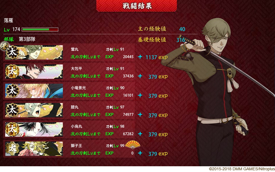で、連隊戦に入る1週間前の12/11に獅子王がカンスト。レベル90だった小狐丸にチェンジしました。