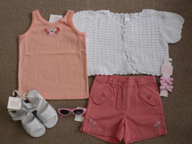 お久しぶりです一週間実家で過ごし、昨日戻ってきましたmimiはたくさん遊んでもらい、庭で駆け回り、元気に過ごしました。私は高校のときの友達と久々に会えて、すごく嬉しかったです 私が不在の間に届いたJJたちです。右3点がHugMeさんから買ったもので、左3点がJJサイトから買ったものです新作BOのタンクは5T、サンダルはサイズ10です。クロシェカーデとSLのショートパンツは4Tで、去年買ったものと合わせたくて購入しました。ヘアアクセは友達へのプレゼントです。サングラスは2-4じゃ無理かと思いましたが、なんとか大丈夫でしたアップ画像を少し。。シンプルなタンクトップですが、生地もお色もやわらかいし、刺繍もかわいい~もちろん、サンダルも去年同様、素敵です♪♪今回の購入はサンダルの復活がきっかけでしたが、結果的には去年のScenic Localeのためのようなものですなじんでいますか~~?もう夏が楽しみです