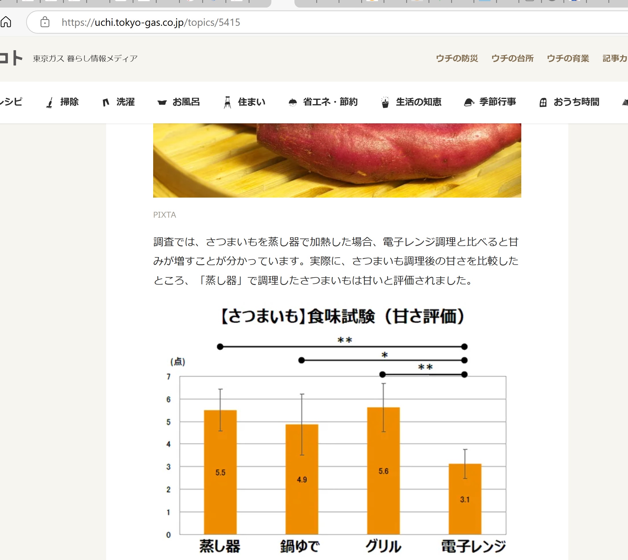 電子レンジでチンすると、結局、蒸したような状態になるので、味は変わらないと思ってました。っが、電子レンジでチンしたサツマイモは甘くありませんでした。っで、コメントで蒸した方が甘いというので調べてみました。結果、茹でたサツマイモよりも若干、甘くなるようですね。参照元は以下のサイトを参照ください。蒸し器と電子レンジはどう違う? メリット・デメリットを徹底調査!【東京ガス都市生活研究所】 | 東京ガス ウチコト電子レンジ=蒸し器のイメージでしたが、考えを改める必要がありますね。蒸し器 シルバー 蒸しプレート カクセー スチーマー フライパンスチーマー 26・28cm対応 FSC-09 フライパン用 鍋用 キッチン用品 蒸し料理 フライパンにのせて使う ふた付 ステンレス製【送料無料(北海道、沖縄、離島は適用外)】フライパンに載せて蒸し器にできる商品もあるようですね。今のことろ、温野菜と肉まんとサツマイモくらいしか思い浮かびませんけど・・・・・。今度、蒸し料理を調べてみるか・・・・・。
