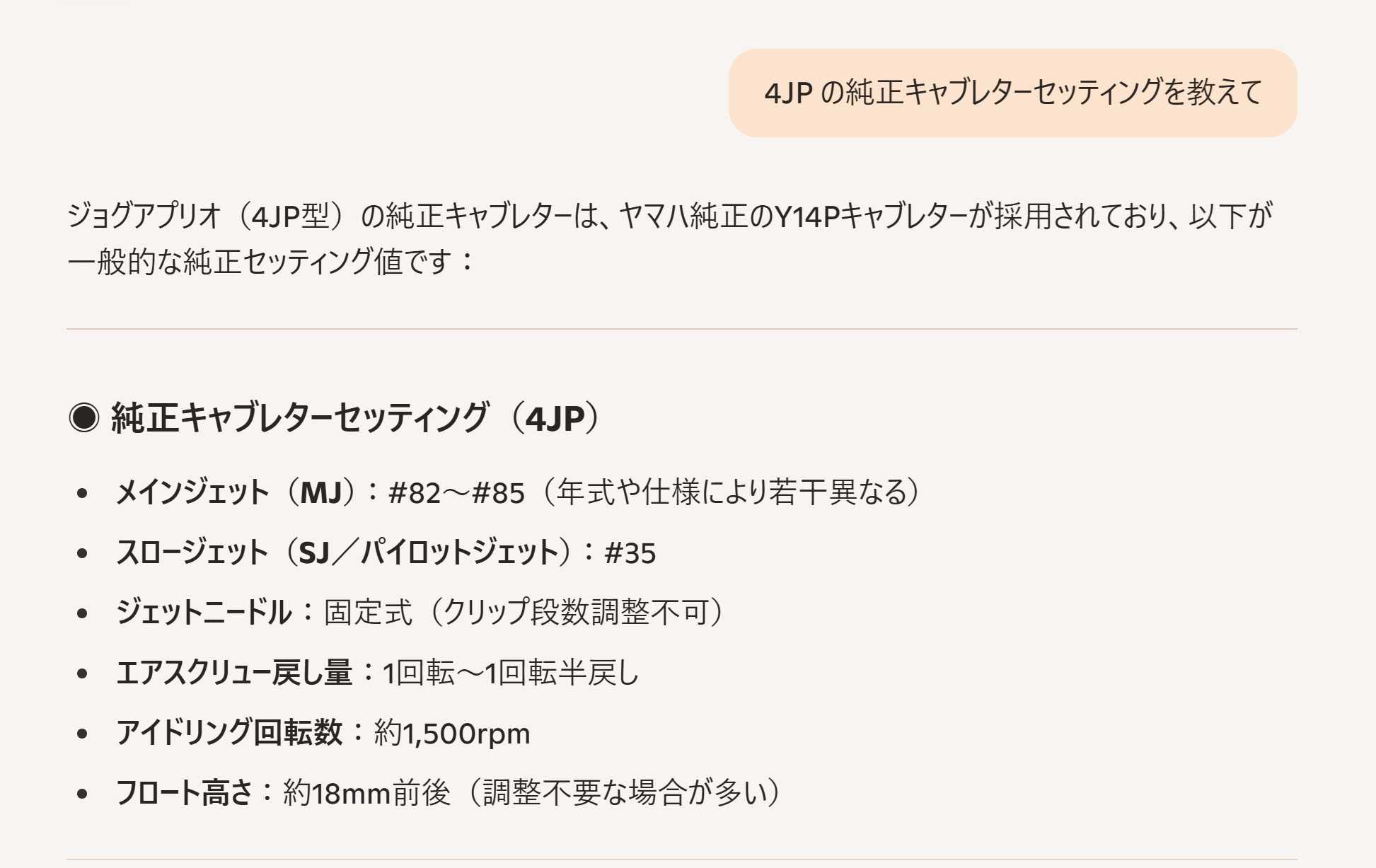 インマニ交換したら、エンジンがかからなくなりました。っで、圧縮測定するためにキックをたくさん実施して、プラグを装着したらエンジンがかかるようになりました。おそらく、これってキャブレター内のガソリンが揮発してなくなってガス欠状態だったものが、キックをたくさん実施することでキャブレター内にガソリンが満たされて、その後、スムーズにエンジンがかかるようになったのではないのか?と推定中。モンキーとかだと、ガソリンコックを開けると、キャブレター内にガソリンが流れ込み、フロートによって、油面が一定に保たれる構造ですが、どうやらアプリオは異なるらしい。っで、copilotに聞いてみると以下の回答が・・・・。ジョグアプリオ(4JP型)には、手動のガソリンコックは装備されておらず、負圧式の自動燃料コックが採用されています。つまり、エンジンがかかっていない状態では燃料が流れず、エンジンの負圧によって燃料が供給される仕組みです。ってことなので、キャブ内が揮発して空っぽになるとガス欠状態で、キックを大量にするとエンジン負圧でガソリンがキャブに流れるのでエンジンがかかるんですね。なので、今度からは鬼キックですね。ちなみに、何日間か放置して、エンジンがかかりにくい車両はキャブレターからガソリンが揮発しやすい状態だということでしょうね。どこから揮発していっているか?は知らんけど・・・・。(今回の場合は、インマニ外していたから、そこから揮発しましたけどね)原因分かったからなんかすっきりした今日この頃。copilotって便利ですね。https://copilot.microsoft.com/copilotで モンキーにロンシン125ccのエンジン載せたいって検索したら自分のブログがヒットしてましたね・・・・。コスパとタイパの良いカスタムだと思うんですけど、やっている人ってそんなにいないんですね・・・・・。