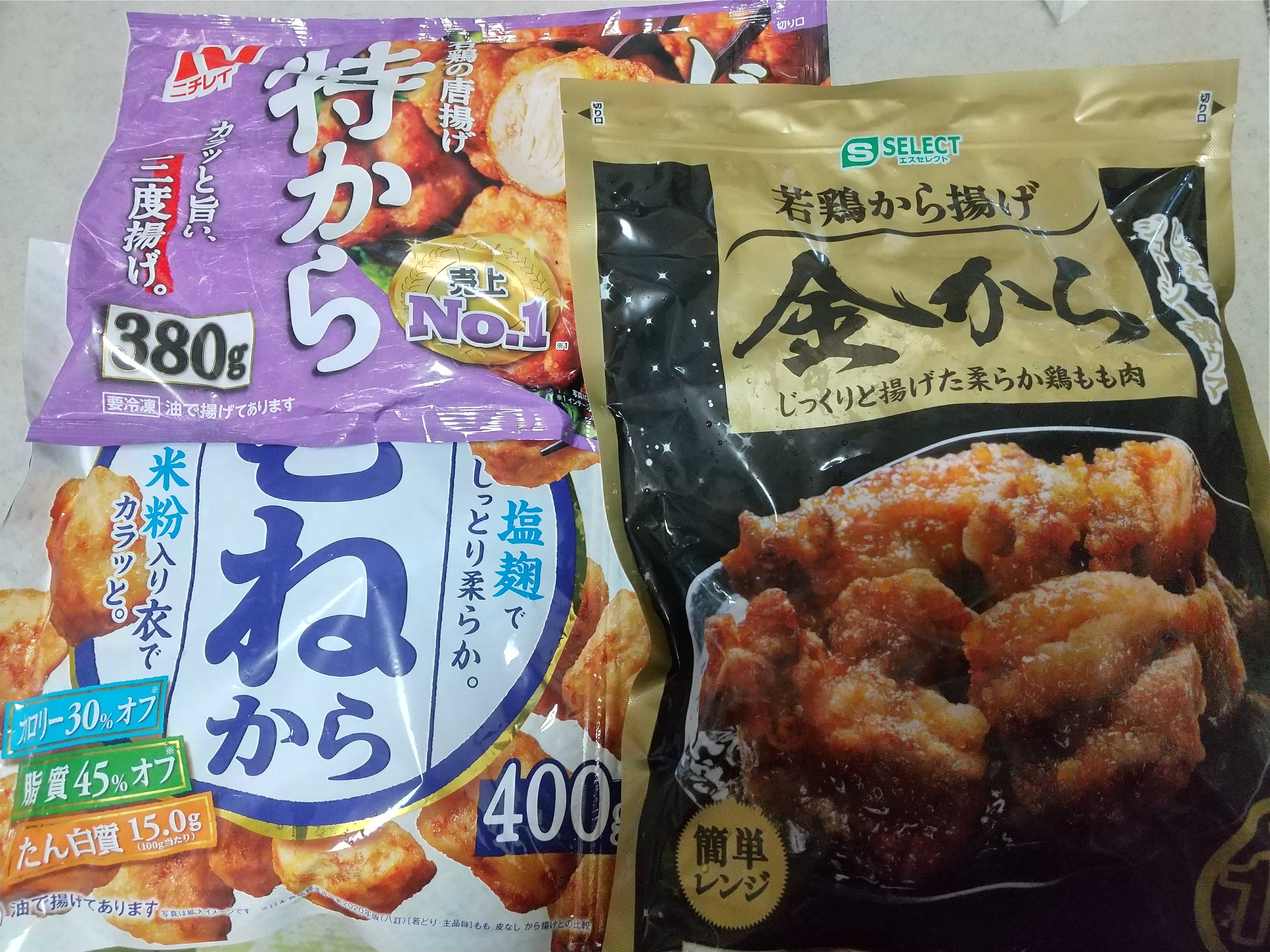 ドラッグストアに行って、冷凍のから揚げ3種を購入。食べ比べてみました。ニチレイのから揚げ。1袋ないに10個程度入ってました。ラップせずに600W5分チン。両方とも330円位でしたが、両方とも美味しかったです。正直、アリですね。っで、スギ薬局のプライベートブランドのから揚げ。これも美味しかったです。1kgで1000円程度。こっちも10個をラップせずに600Wで5分チン。あったかご飯を炊いておけば、ほっともっとのから揚げと同等の満足感がありますね。冷凍食品って季節問わず、値段と味(品質)安定しているので神アイテムですね。