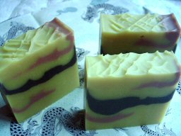 タイトル通りに冬=白をメインに2種類作ってみましたが、カット後しばらくして残念な事が‥ まずは見ていると、とても寒く感じるこちら 2種類の紫根石鹸と先日作ったキッチンソープを 細かくカットして入れたものです この石鹸と下の石鹸はパーム・パーム核・キャスターは 入っておりません へーゼルナッツとピュアオリーブを1対1として、 ココアバターとホバオイルをあわせて100g投入 オプションはヨーグルトパウダーと牛乳 SFにオリーブスクワラン のみです こちらは白い薔薇をあしらったちょっと大人可愛い系狙いました ベースの生地の部分は上のブルーバージョンと同じです *薔薇の部分の材料* オイル オリーブ、ココアバター、ホホバ、パーム、パーム核 その他 精製水、牛乳、苛性ソーダ、真珠パウダー、コラーゲンパウダー 精油 イランイランEx、クラリセージ、ゼラニウム、ゆず ローズマリー、カモミールローマン 中々良い感じじゃないのとほくそえんでいた?のもつかの間… カットして3日後… 何故かこちらの石鹸だけ… 薔薇石けんのほうは白いままなんですが・・・。 こちらの石けんは、中味だけが山吹色にどんどん染まっていく~~ (画像よりも実物のほうが若干濃いかな?) 侵食しているかのようにジワジワと染まっていってます でも何故かモザイクの周りだけは枠を取っているかのように 白いままなんですよね~ という訳でもくろみは奈落の底へ… 香りはこんな感じにしました ローズウッド、ローズゼラニウム、おかむらさき レモンマートル、フランキンセンス 優しい花の香りにレモンマートルが ちょっと良いお仕事をしてくれたように 自分的には感じます 使用感に期待するとします…。 参ったなぁ……… ******************* ここ最近の事件簿 携帯紛失(金曜日夜から) プリンター:カラーの色が出なくなる クリーニング効果なし 黒のみ出る 家の前の私道の状態がひどく市と住民で工事費負担 1世帯当たり 70万円の負担見込み アイタタタタタ~~~ そのほかお父さんの歯の治療代に30万かかりました 続くときは続くものですね・・・(涙) 年末もガッツリ働かなくては! オウ!!