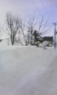 今日も相変わらず雪は降り続いたが、昨日までと比べると一段落かな?今日は昨日よりは寒くなかったので、少し早めに散歩に出てみる事にした。いつもより1時間早いだけだけど、気温的には結構きつい。歩道はますます狭くなり歩くのが大変そんな状況なのに歩道に除雪機で雪を積み上げる非常識な奴が!ここは通学路で子供が通る道なのに、これじゃあ車道に出ないと通れない!事故にでもなったらどうするつもりなんだろう? 通行人と比べると雪山の高さが分かります。人の背の3倍近くありそう。って事は5メートル!!早く排雪が入ってくれないと生活出来ないぞ。 雪で非常に歩きにくくて良いリハビリになった。帰って来てからは背中の痛みに悩まされ、一日身動き取れなかった。今までには無かった痛みで心配だ。今まで痛みを感じなかった体が、痛みを感じる事が出来るのは進歩なのかも知れないが、座っても寝ても立っても、何をどうしても痛い。困ったものだ。良い兆候だといいんだが・・・
