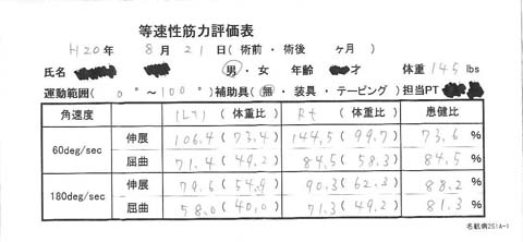 ボルト選手の200M快走に奮起して、左膝の手術後(半月板損傷)、初の筋力測定に挑んでみました。左右比は少なくなったようだが、左側の筋力が、体荷重に対して50%前後以下であることが分かった。。へぼいっす・・・。自分:「以前よりは良くなってますよね!?」リハビリの先生:「低いレベルで上がっても変わらないよ!」自分:(くそー)「サッカー、やっていいですか??」リハビリの先生:「今の状況は厳しいよね!僕なら絶対にやらないよ!!やっぱり100%は欲しいよね!」自分:(プシュー・・・。。。)「次回、鍛えなおして来ます!」切ないっす。。 見てろー!! フ~ 自分に甘い僕でした。。(^_^;)