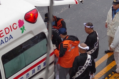 だんじり祭の関係者が次々と倒れ?救急車で運ばれて行きました。暑くないので熱中症ではないと思いますが…。屋根の上からマイクを持って誘導・注意をする、大阪府警の婦警さんたちは降りしきる大雨の中をご苦労様でした。-----------------------------------------ブログ・ランキングのバナーです。クリックして頂ければ幸いです。-------------------------TWITTER/ツイッターもやっています(*^^)v。--------------------------------------------------