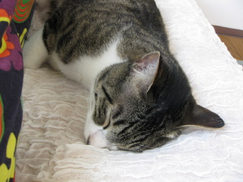 昨日は義妹が次女と三女を連れて遊びに来ました。次女は部活、三女は体操、一緒にお休みの日は中々ないらしく、珍しく同時にお休みだった昨日、『どっかに連れて行って』 と言われ急遽、我が家へ…(他に行くとこはないんかい) そして今週末は、友達が子供を連れてお泊まりしに来ます。 夏の暑さはさほど感じない岩手ですが…子供が来れば、熱気で、嫌でも夏の暑さを感じそうです 2日半ほど良いお天気でしたが…今日はまたまた肌寒い日となりました。マジ、夏は何処へ。。。 鳥も蝶も飛んでおらず、外を眺める楽しみがないはっぴーくんしばらくは[蹴りぐるみ] で遊んでいましたが、 この寝方はなんなのでしょう… 蹴りぐるみを私に取られないように前足・後ろ足でしっかり押さえ込んでぐっすりと寝ておりました