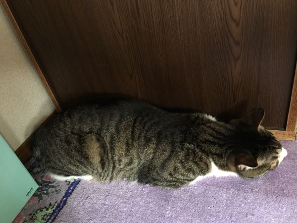 いた、いた、旦那くんの机の下にいました。