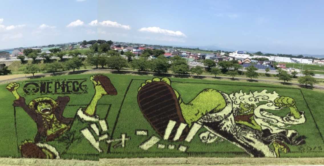 色の異なる稲を絵の具代わりに巨大な絵を描く