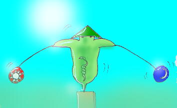 家のトイレには、大きな年間カレンダーが一枚張ってある。座ると目の前にあるので、つい目がいってしまう。 知ってました!一年って約90週しかないんですよ! もうすぐ春がきて、桜が咲いて・・ 梅雨がきて・・ 夏になって・・ またクリスマス・・・あっという間だなあ・・ とか考えながらトイレに座っている。プランニングをすることもある。いろいろな夢のプランを楽しむ♪¥支払い¥の日付を思い出してこういう顔になることもある (*_*);考えてみれば、トイレの中の”思考の時間旅行”だ。一年間では物足りない。そうだ!時間の枠を広げたければ、歴史年表を張ればいい!♪縄文土器・・源平時代・・義経や、戦国時代 戦国武将、・・幕末の志士たち、坂本竜馬・・・ 近代を開いた人たち、古きものを守ろうとした人たち、・・いろんな歴史上の人物。小説でおなじみの人に思いをはせられる。日本旅行なら日本地図♪を張ろう!行ったことのあるところ。行きたいところをチェック。世界旅行なら世界地図がいい♪手軽なイメージのトラベルを楽しめる!いいアイデアだなあ!さっそく明日買いに行こう。自分のイマジネーションのため。・・・・子供の勉強のため(笑) 絵のポスターなんかもいいですね。 イメージをたどっていけるもの・・ 夢をプランニングできるもの・・・ そんな一枚を探してきて、 トイレの目の前の壁に張ってみよう! 一日のわずかな時間を楽しもう。 白紙の模造紙を張って、カラーペンを用意 自分だけのイメージの地図を作るのもいいなあ♪ ゆっくり、ゆったり、トイレでイメージトラベル♪ ゆったりとスローに体と心を味わえば、・・・ 生活の中のヨガが生まれます。 今日のイラストは ”空とぶ やじろべー☆バランスの天使”です。 スローなヨガ的習慣術・INDEXへ
